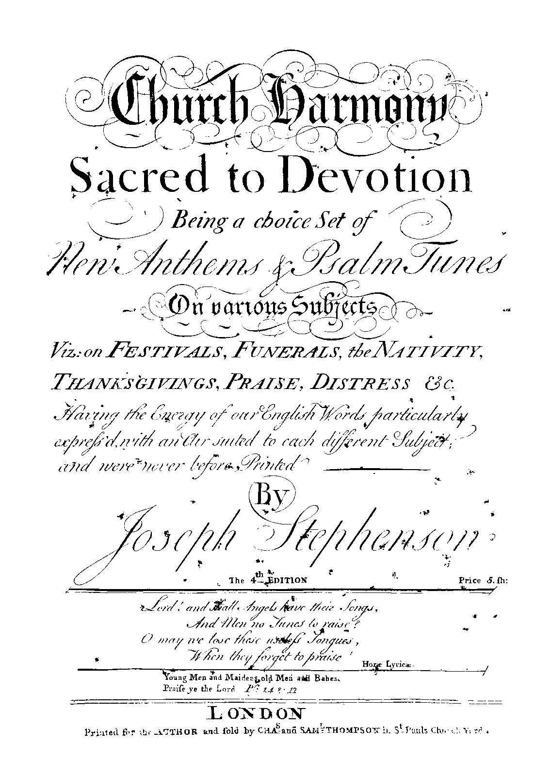 Church Harmony Sacred to Devotion, Being a choice Set of New Anthems & Psalm Tunes On various Subjects Viz: on Festivals, Funerals, the Nativity, Thanksgivings, Praise, Distress &c. Having the Energy of our English Words particularly express'd, with an Air suited to each different Subject; and were never before Printed