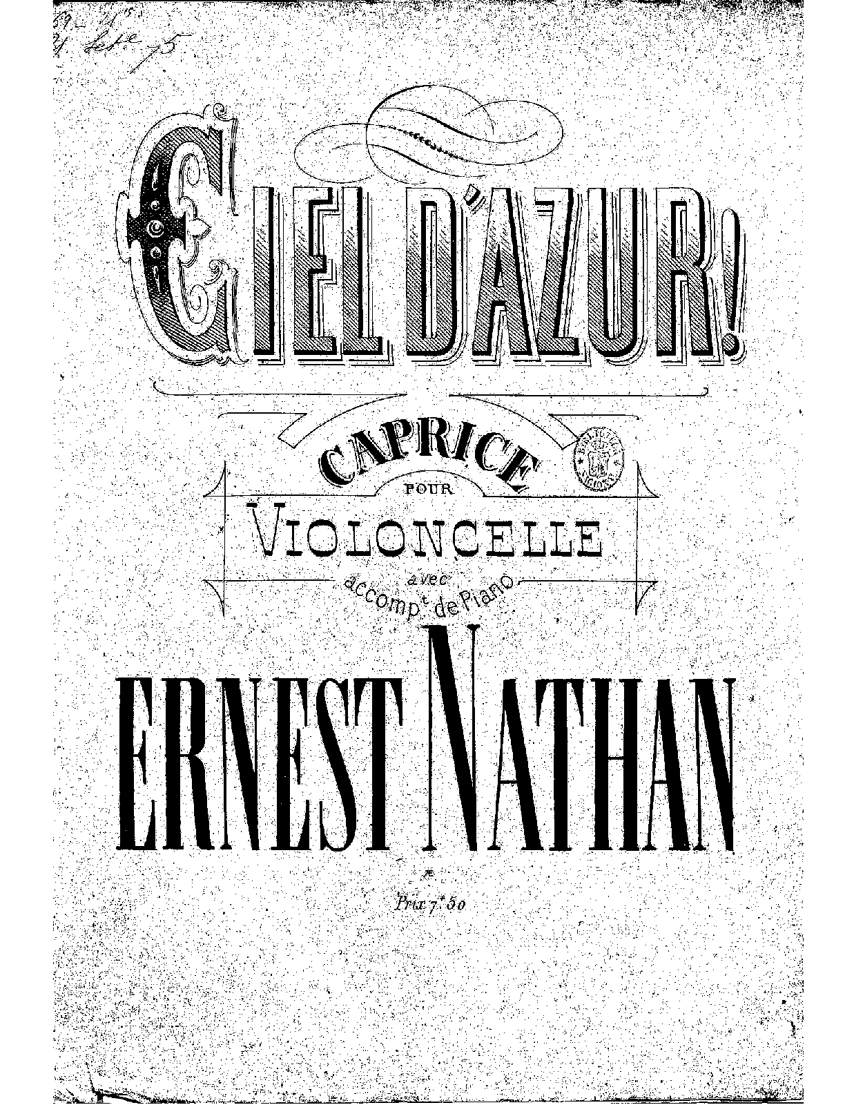 Published in 1875 as one of eighteen individually published scores collected under the Nouvelle collection pour violonecelle et piano. Assuming this is the first appearance of Ciel d'azur!.