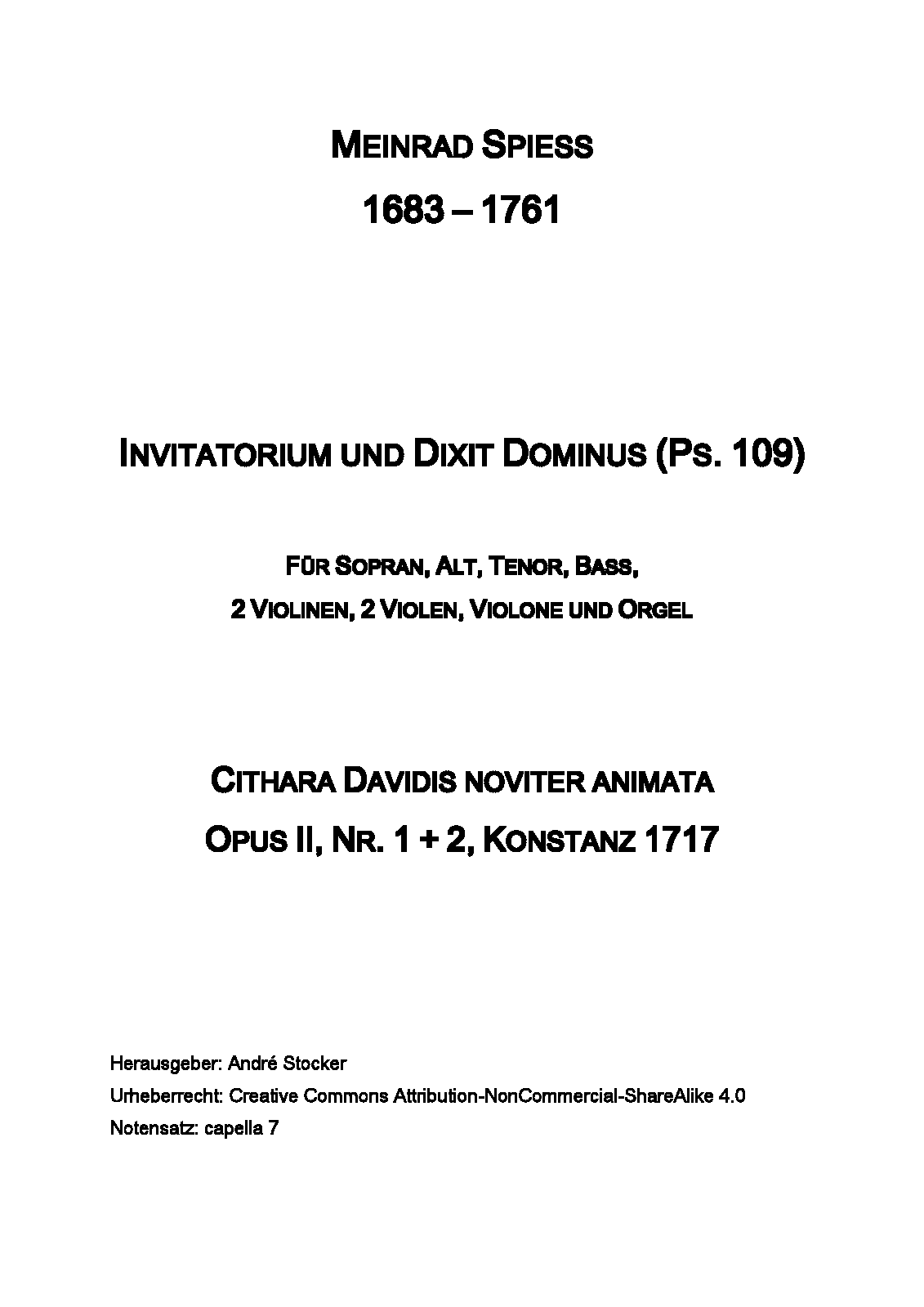 | Alternative. Title | Cithara Davidis noviter animata, hoc est Psalmi Vespertini, a 4 Voc. ordinariis. 2. VV. 2. VV. Violone. Organo. & ad Psalmos intermedios una voce principaliter praecinente. Authore P. Meinrado Spiess ... Opus II. |