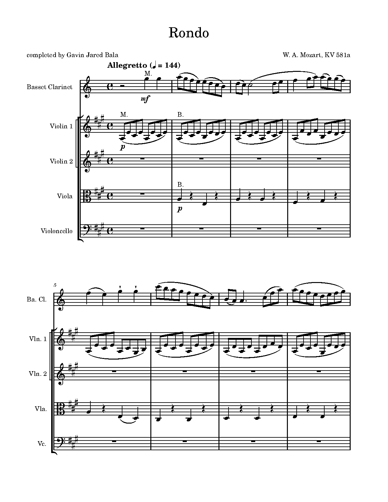 This completion also incorporates the last page of Mozart's fragment (up to bar 110). The letters M. and B. throughout the score indicate which parts were composed by Mozart or the arranger, respectively.