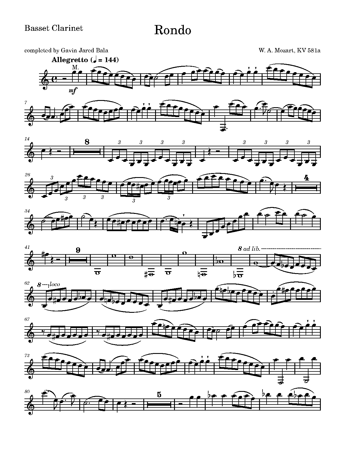 To make it more accessible, this completion is intended for the more common standard clarinet, despite Mozart's intention having been a basset clarinet. With the exception of a low E-flat that Mozart wrote in the existing fragment, it does not use the basset notes; and an alternative is provided to play this note an octave up. The completion writes up to written g''' for the clarinet, which appears in the Clarinet Concerto (third movement, bar 92).