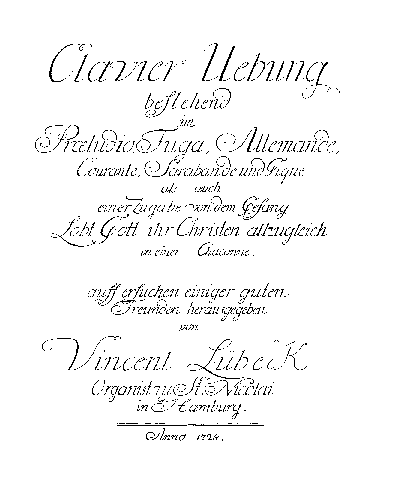 | Opus/Catalogue NumberOp./Cat. No. | LübWV 16 (Präludium und Fuge a-Moll), LübWV 17 (Suite g-Moll), LübWV 18 (Lobt Gott, ihr Christen F-Dur) |
