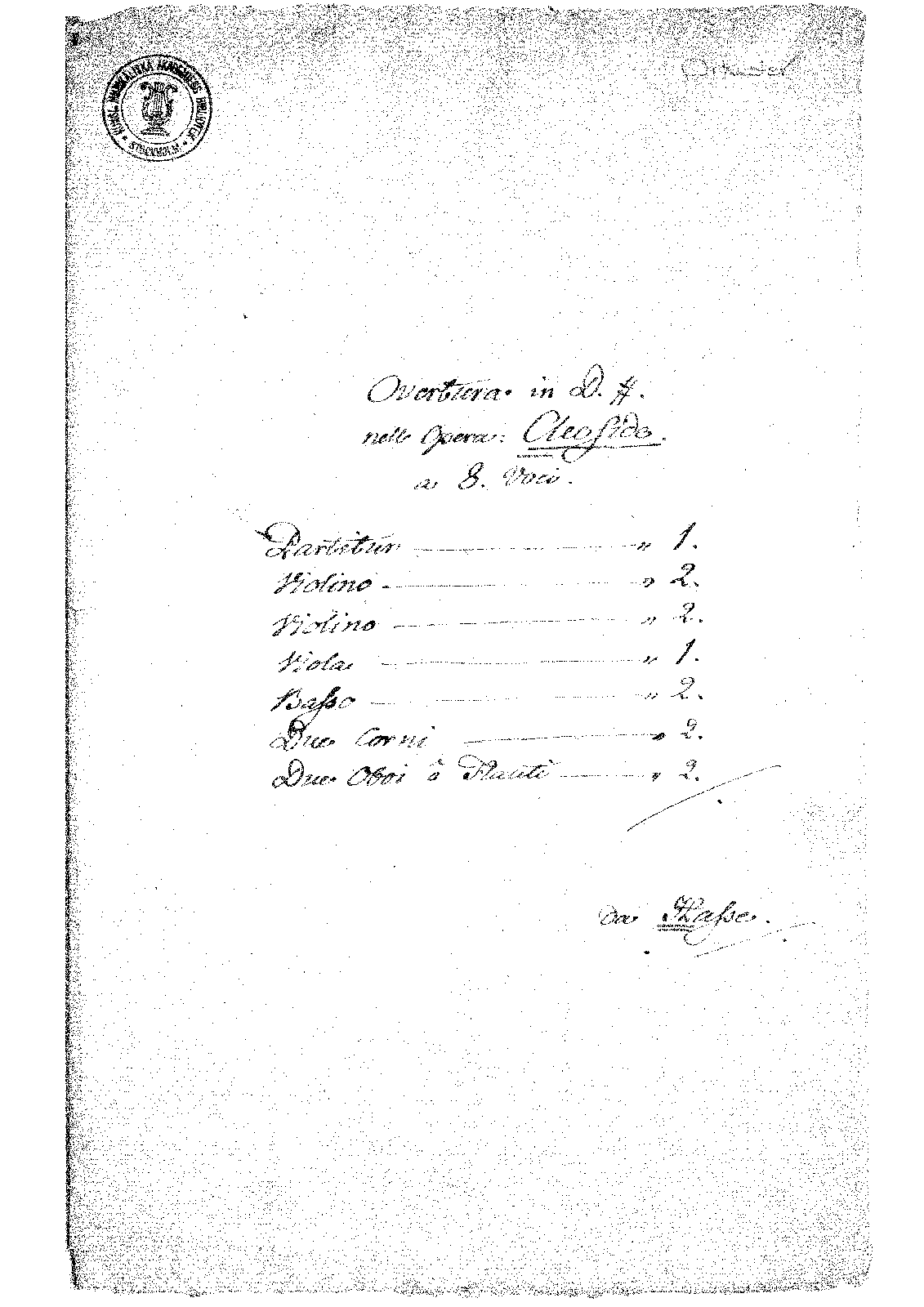 Instrumentation 3 sopranos (Cleofide, Erissena, Gandarte), 3 contraltos (Poro, Alessandro, Timagene), chorus, orchestra, continuo