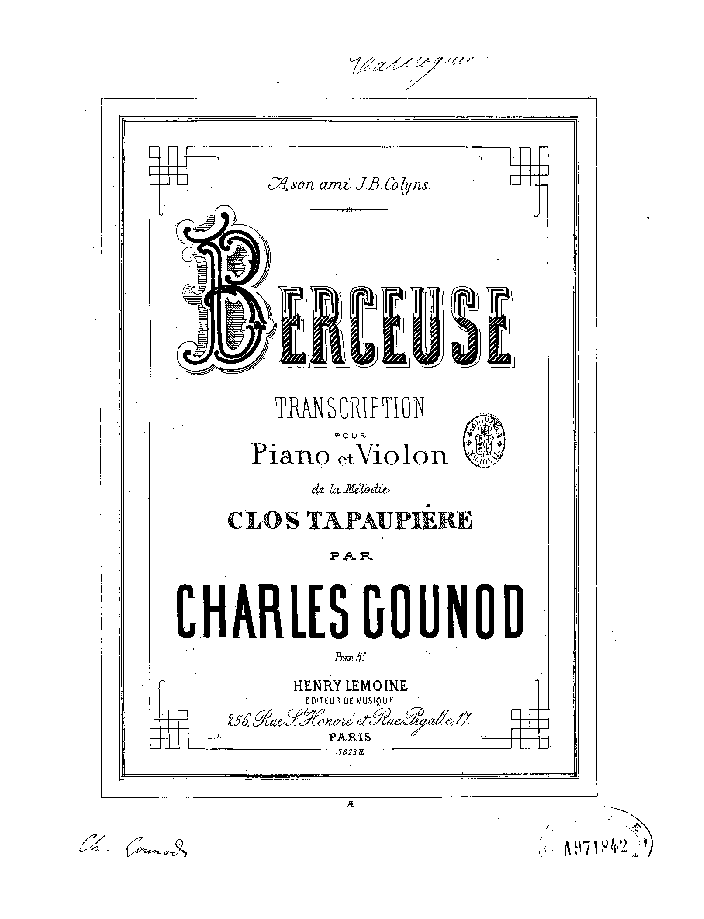 | Extra Information | Transcribed by Gounod for violin and piano as Berceuse, and this title is used in many subsequent arrangements. Grove indicates erroneously that these "Berceuse" arrangements are based on another song, Loin du pays. |
