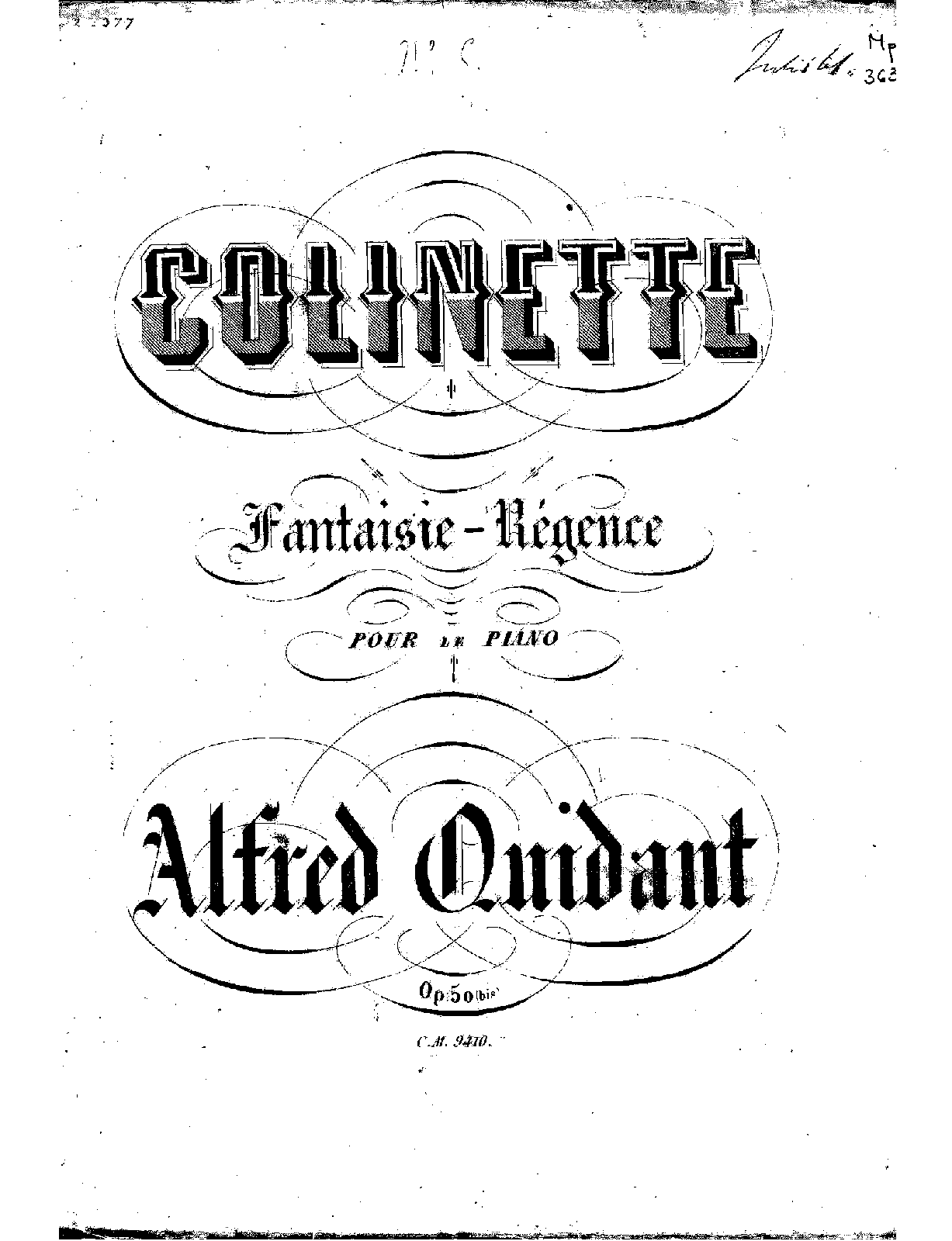 On the first cover page and on the first page of music in the publication by Gérard the work is listed as Op.50bis. On the second cover page it is listed as Op.52. Schott published a work entitled Le premier Soupir. Nocturne de Salon as Quidant's Op.52 (Monatsbericht (1862), p.64) and also published Colinette as Op.51 No.1 (Monatsbericht (1862), p.218). Schott's publication of Op.50 was a work entitled Improvisation sur Orphée, de Gluck. Fantaisie pathétique (Monatsbericht (1861), p.51).