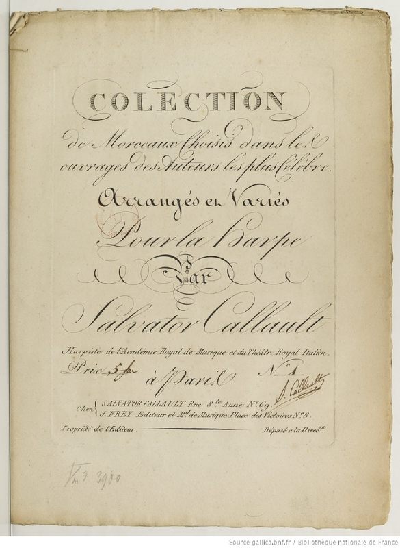 | Alternative. Title | Colection [sic] de morceaux choisis dans les ouvrages des auteurs les plus célébre [sic] arrangés et variés pour la harpe |