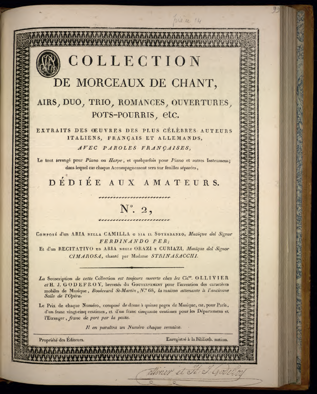 Alternative. Title Collection de morceaux de chant, airs, duo, trio, romances, etc. Extraits des oeuvres des plus célèbres auteurs italiens, français et allemands, avec paroles françaises, le tout arrangé pour piano ou harpe, et quelquefois pour piano et autres instrumens ; dans lequel cas chaque accompagnement sera sur feuilles séparées
