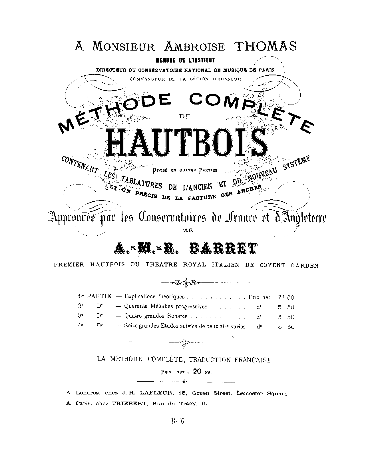 A Complete Method for the Oboe, comprising all the new fingerings, new tables of shakes, scales, exercises &c. &c. with an explicit method of redd making [...] composed by A.M.R. Barret. First Oboe of the Royal Italian Opera Covent Garden.