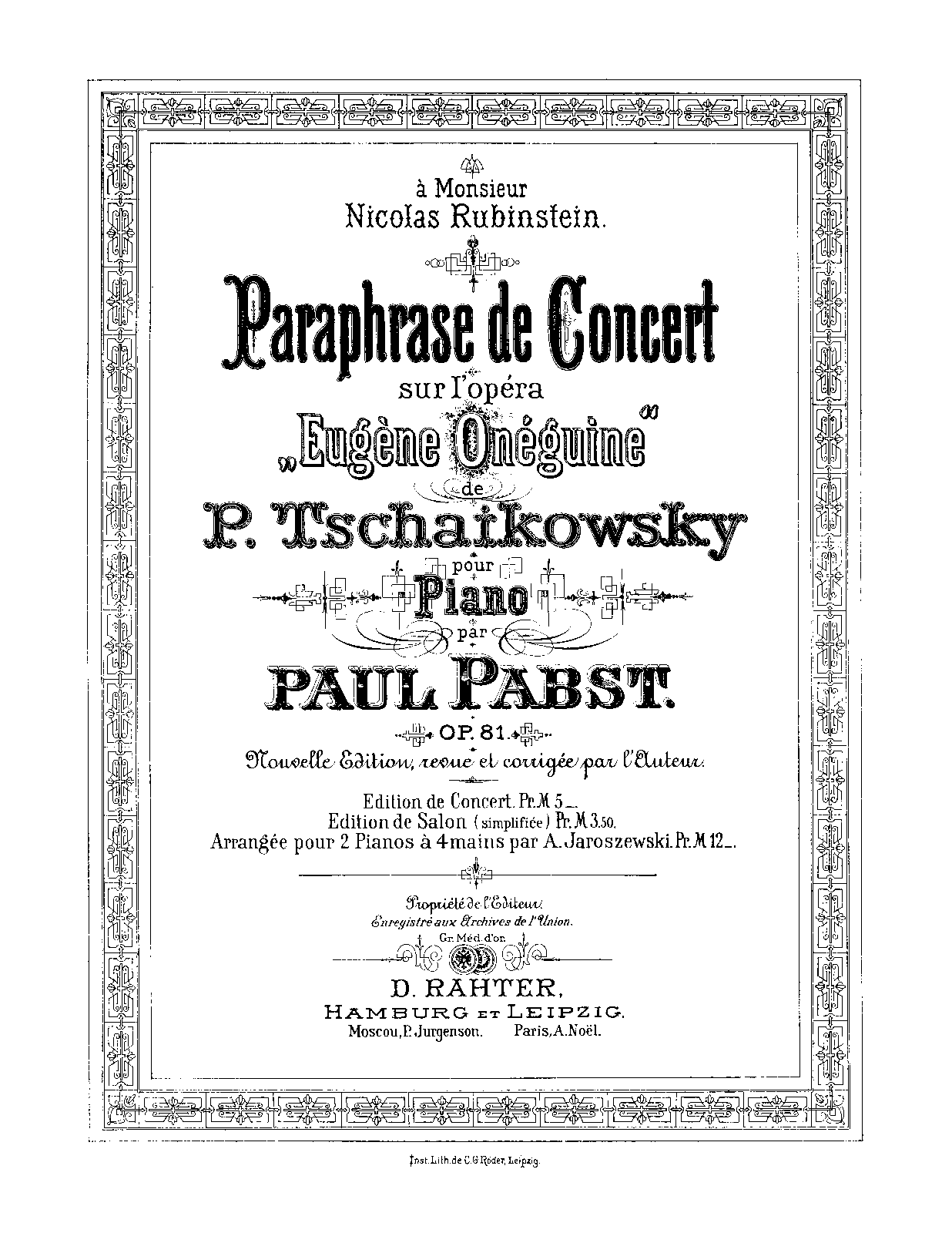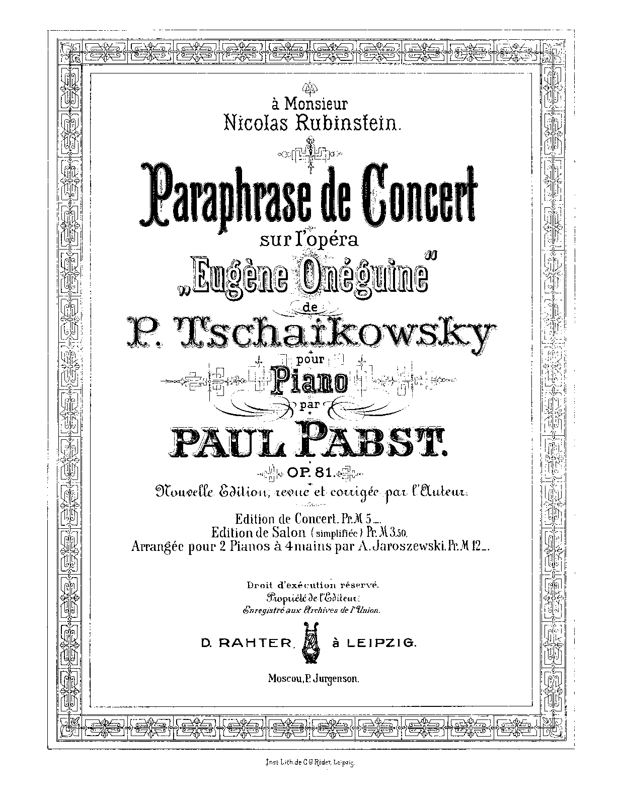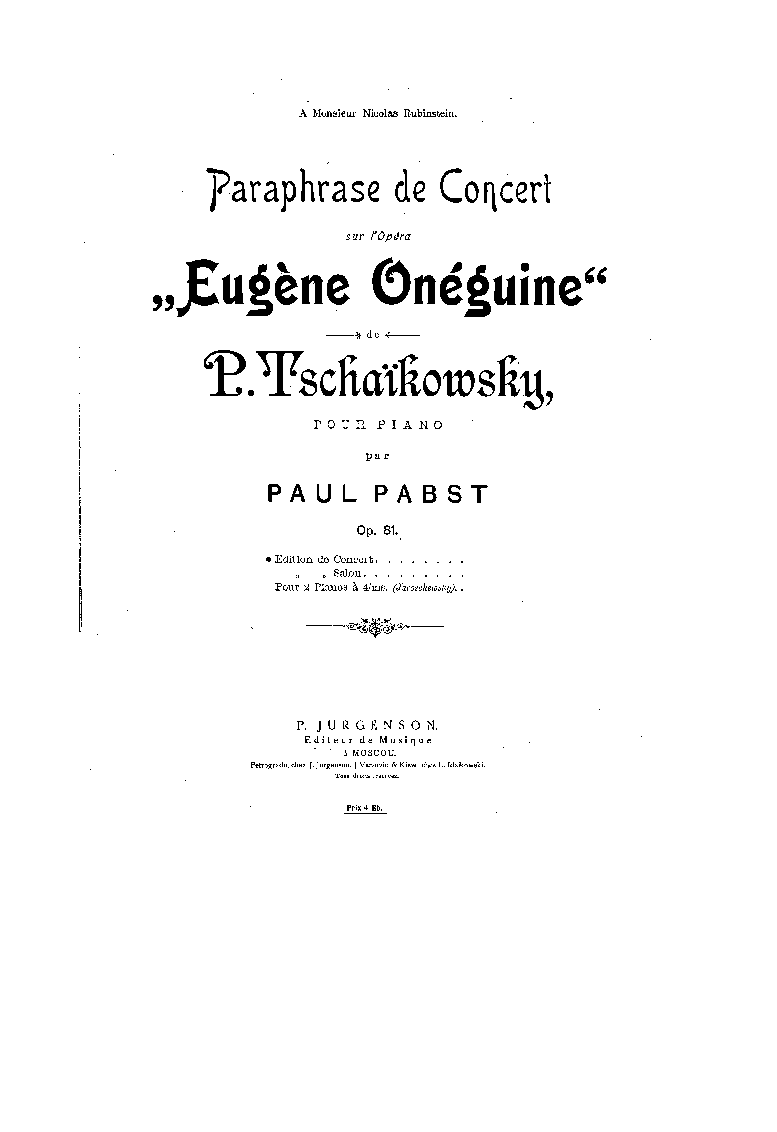 Paraphrase de Concert sur l'opera 'Eugene Oneguine' de P. Tschaikowsky