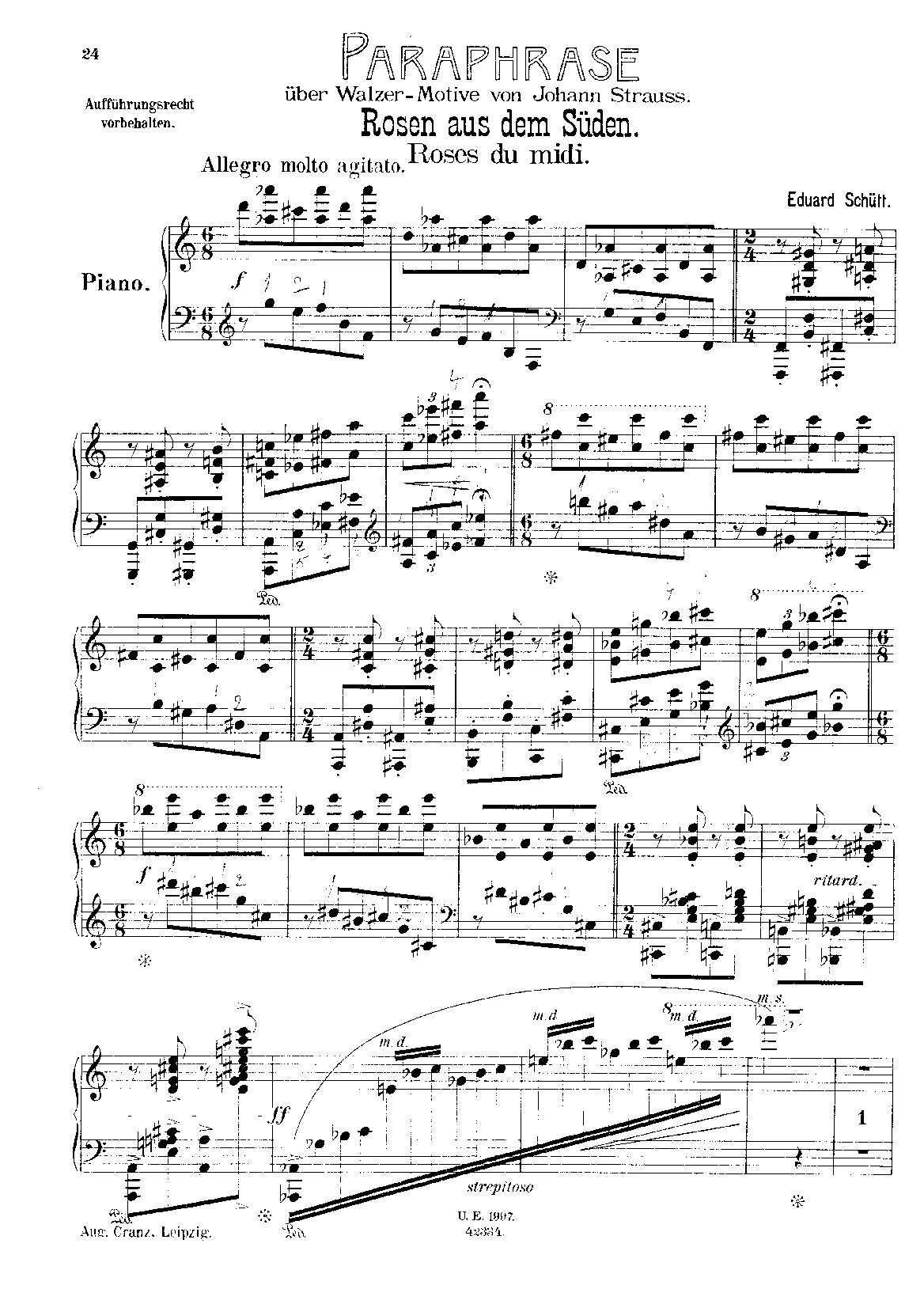Concert-Paraphrasen f. Pfte über Walzer v. Joh. Strauss. No. 4. Schatz-Walzer. No. 5. Rosen aus dem Süden. Hamburg, Cranz. Monatsbericht (1892), p.452