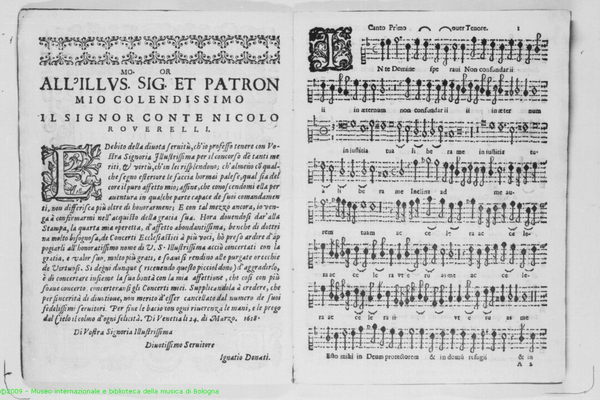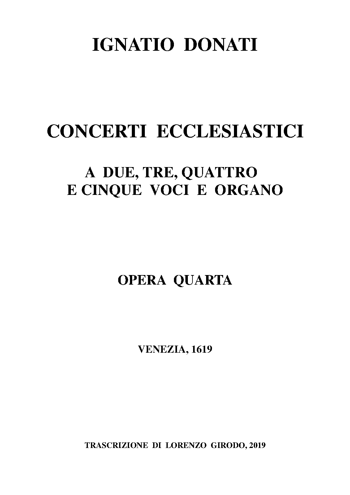 | Alternative. Title | Concerti Ecclesiastici a Due, Tre, Quattro, & Cinque Voci. Con il Basso per sonar nell'Organo. D'Ignatio Donati Maestro di Capella dello Spirito Santo di Ferrara Opera Quarta. Dedicati all'Illustrissimo Signor Conte Nicolò Rouerelli |