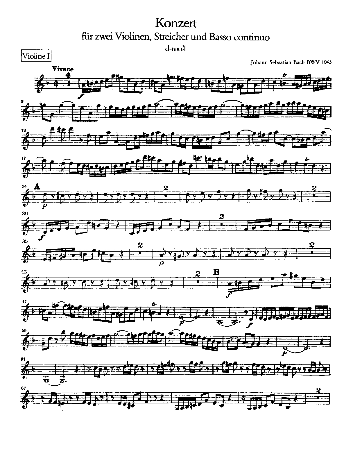 Name Aliases Konsert for to fiolinar, strykarar og continuo i d-moll; Double concerto pour violon; Concerto pour deux violons; Concerto pour 2 violons; Concerto pour deux violons en ré mineur; Concerto pour deux violons, cordes et basse continue en ré mineur; Concert per a dos violins de Bach; Concert per a 2 violins en re menor; Concert per a 2 violins de Bach; Doble concert per a violí; Koncert pro dvoje housle a smyčcový orchestr; Koncert pro dvoje housle a orchestr