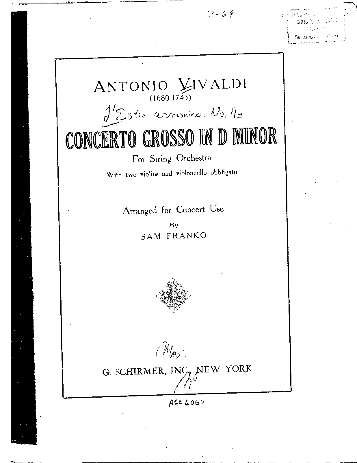 | Genre Categories | Concertos; For 2 violins, cello, strings, continuo; Scores featuring the violin; |