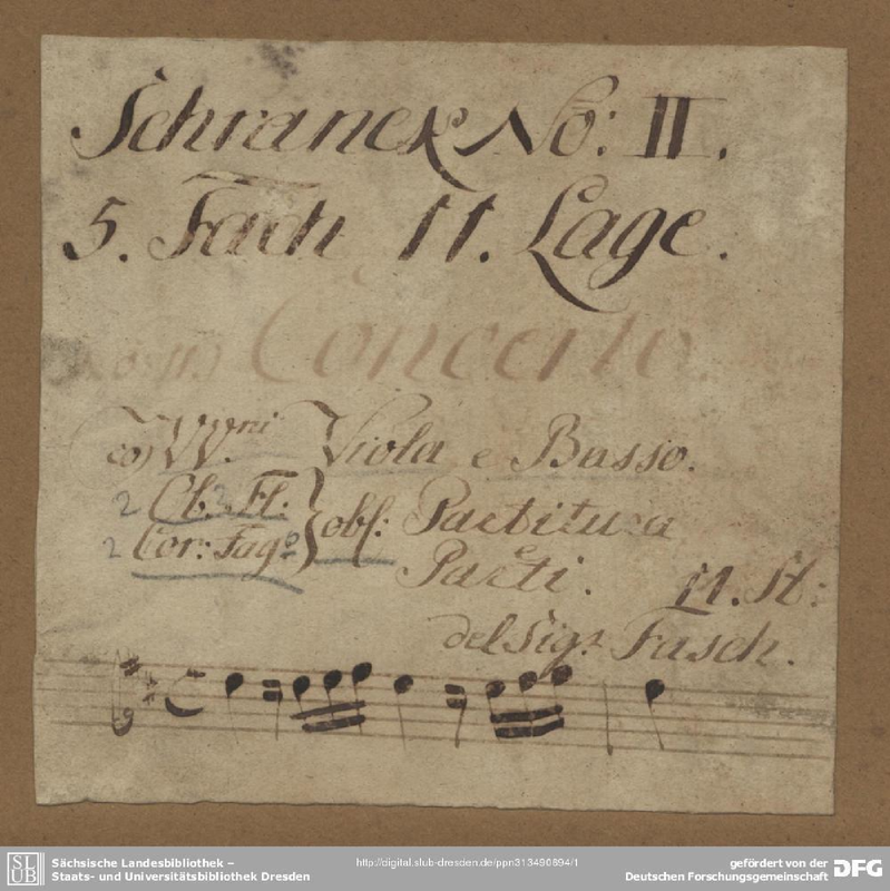 | Extra Information | The score (D-DL, Mus.2423-O-20) and parts (Mus.2423-O-20a) are essentially different works, the first movement sharing some material, the second movements being completely separate pieces and the third being quite similar. The score breaks off 8 bars after the double bar repeat, so a short bridge section has been constructed to return to the version from parts, and some changes made to reflect differences in the score. |
