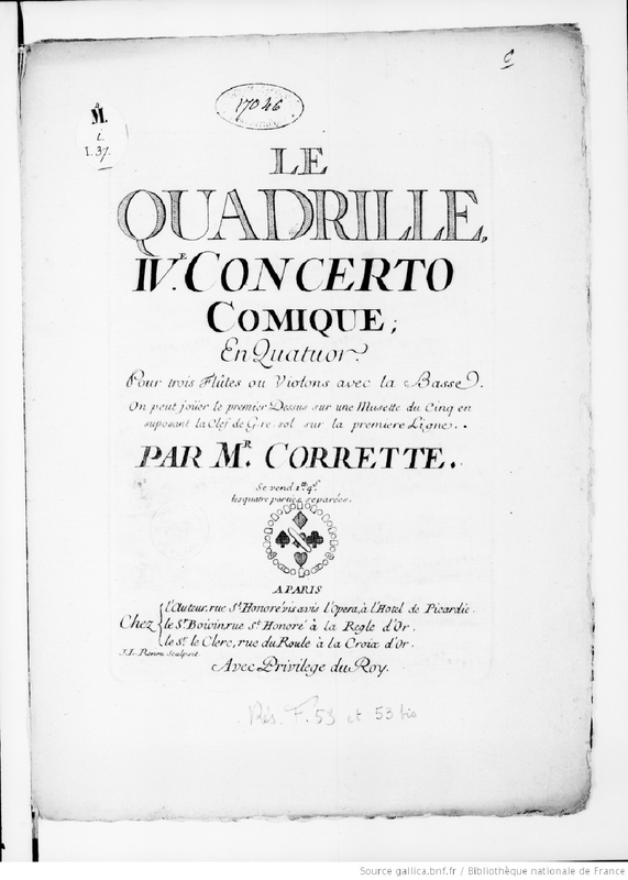 Le Quadrille, IVe. Concerto Comique, en quatuor pour trois flutes ou violons avec la basse. On peut jouer le premier dessus sur une musette de cinq en suposant la clef de G re sol sur la premiere Ligne
