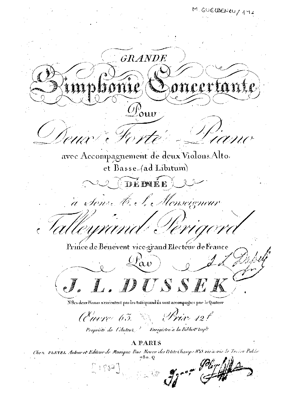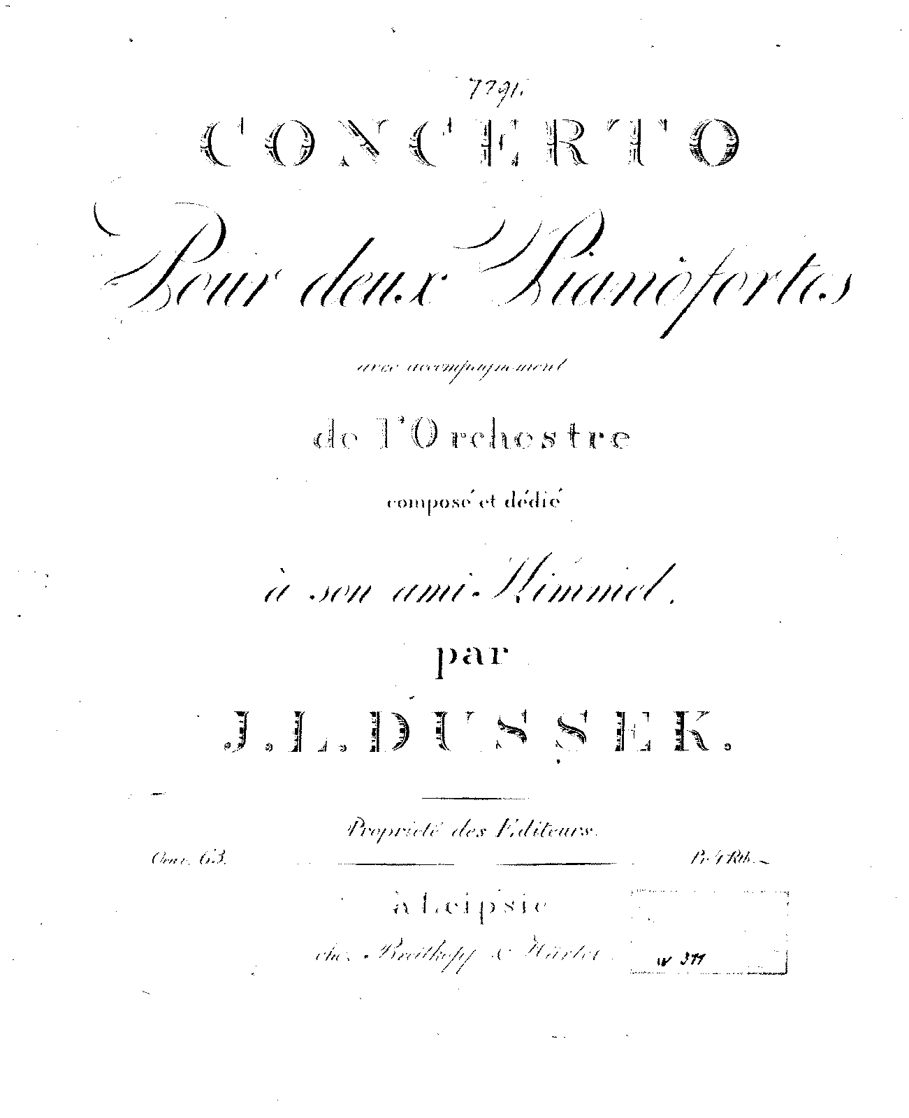Second(?) edition of the concerto (ca.1810: London: Gianchetti & Sperati) was published as "Grand Symphony Concertante for two Piano Fortes" (plate no.11), according to Lindeman (Structural Novelty and Tradition..., appendix, p.230.) (According to Worldcat, this edition was "Published after the Parisian edition [the Pleyel] done under the direction of the author, by Cianchettini & Sperati" and if so, the title probably also met with the approval with the composer as a permissible alternate. If anything, "concertos" should be removed from the tags if a use of "concerto" to describe the work with Dussek's approval or even pre-1813 can't be found. Scan of London print (also first piano part only, unfortunately-- however, also piano solo parts of many of Dussek's other piano concertos, which could be used to at least begin workpages for them if not done already...): see Dussek Concertos for the pianoforte, Thematic Index, and Solo Parts - 2 Piano Concerto, Primo Part.