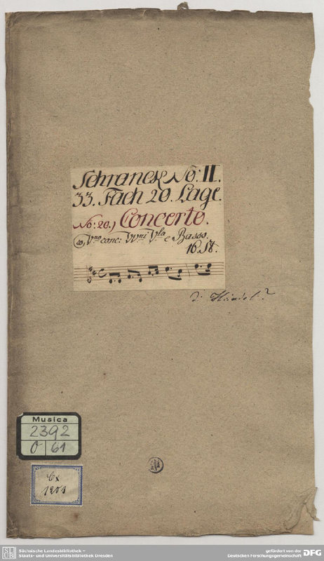 Schrank II coll. Sächsische Landesbibliothek, Dresden (D-Dl): [1] As well as solo parts for violin, cello, bassoon and horn, this arrangement also includes ripieno parts for 3 oboes (doubling violins) and 2 bassoons.
