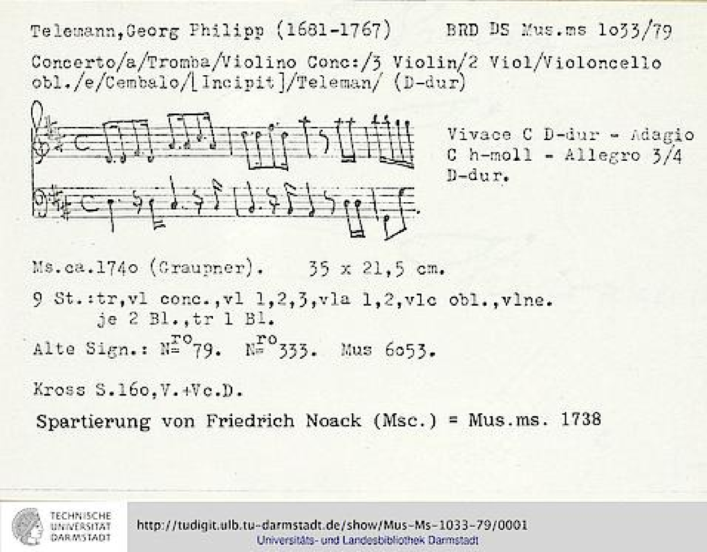 (note: not copied by Pisendel, but -inspired- by Pisendel possibly. See Music for a Mixed Taste (Zohn's book on Telemann's concertos). Seems also to have been copied out by Pisendel. Regarded by Zohn as mostly a violin, not trumpet, concerto, with trumpet and cello obligato part; he also conjectures that Pisendel rewrote some parts when recopying the work in Dresden - perhaps the Darmstadt version differs substantially. Zohn: "the technical demands of the solo episodes are almost without parallel in Telemann's concertos.... if this concerto was not written by Pisendel, it must have been inspired by another violinist of uncommon ability.") Probably composed after 1715.