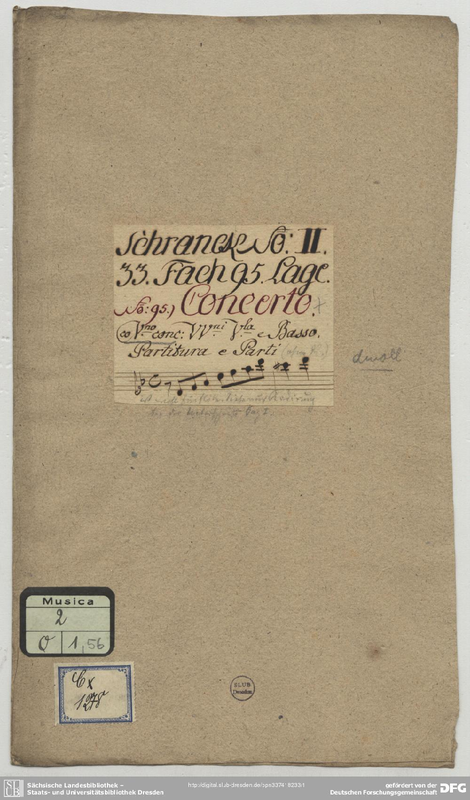 Under the label on the title page is written "probably for flute". On page one of the score, under "à Violino" the original instrument allocation has been erased. The back page contains several sketches by Pisendel, probably the reworking of the solo part for violin that would have been copied into parts. Unfortunately parts don't exist.