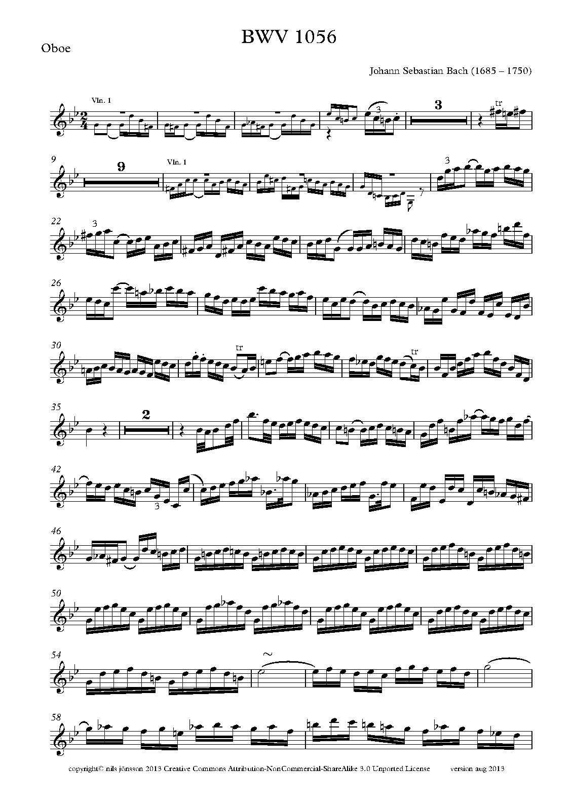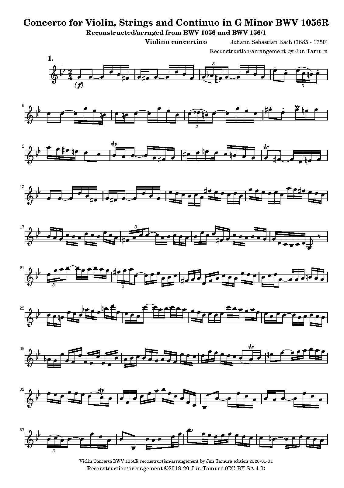 The famous "Largo" (also known as "Arioso"), an arrangement of BWV 1056/2 and/or BWV 156/1, a piece often performed as the second movement of the concerto, is included as "Appendix" in this edition, since this "Largo" is known NOT to belong to the original violin (or oboe) concerto. Please refer the editorial note included in the scores for details. (10 June 2021, Jun_T)