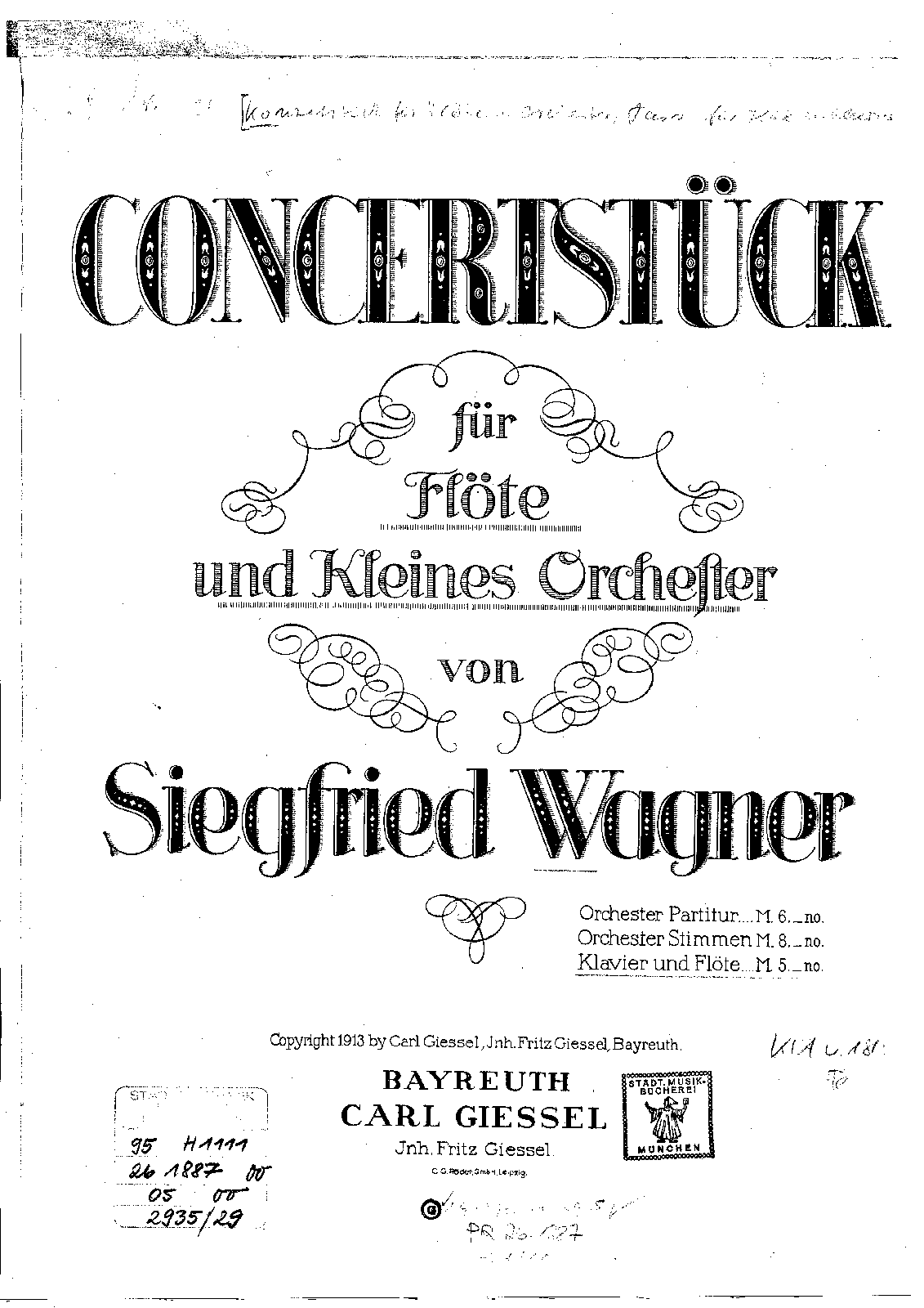 Extra Information *Review for premiere info. According to the latter page this also goes by the name Concertino for Flute and Small Orchestra, but I don't know if that's an authentic name for the work. (later comment; i think the earlier one is also by me) Orchestration from Free Library of Philadelphia catalog. -- Schissel. (Only the English sections- translations- of the preface above refer to it as a concertino- the German original has it as Konzertstück throughout.)