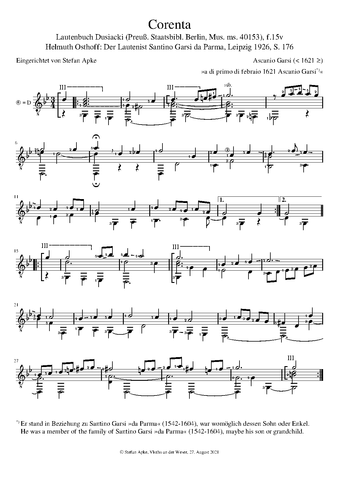 A transcription (piano score) from the original lute manuscript was made by Helmuth Osthoff. It is included in his book Der Lautenist Santino Garsi da Parma.