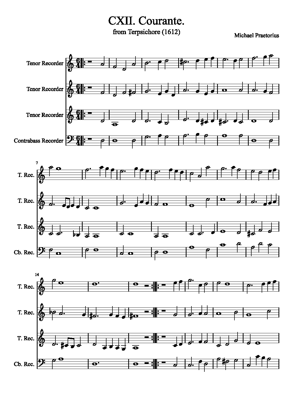 | Extra Information | These pieces were assembled and arranged by Praetorius for his 1612 collection. It is unknown how many, or if any, of the works in the collection were actually composed by Praetorius as opposed to being popular dance tunes arranged by him. The instrumentation is not specified in the original, and simply listed as "à 4". |