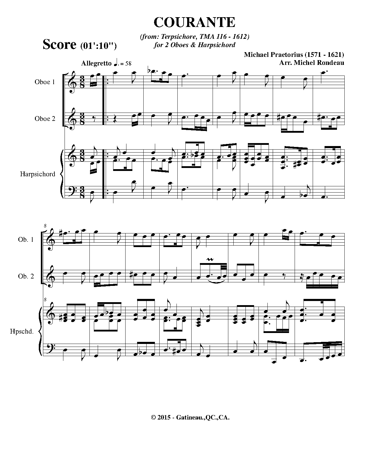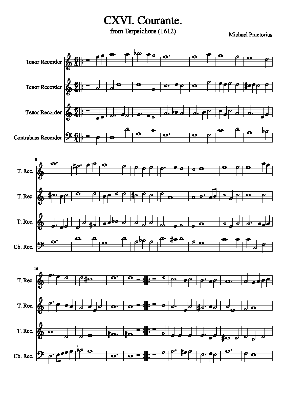 | Extra Information | These pieces were assembled and arranged by Praetorius for his 1612 collection. It is unknown how many, or if any, of the works in the collection were actually composed by Praetorius as opposed to being popular dance tunes arranged by him. The instrumentation is not specified in the original, and simply listed as "à 4". |