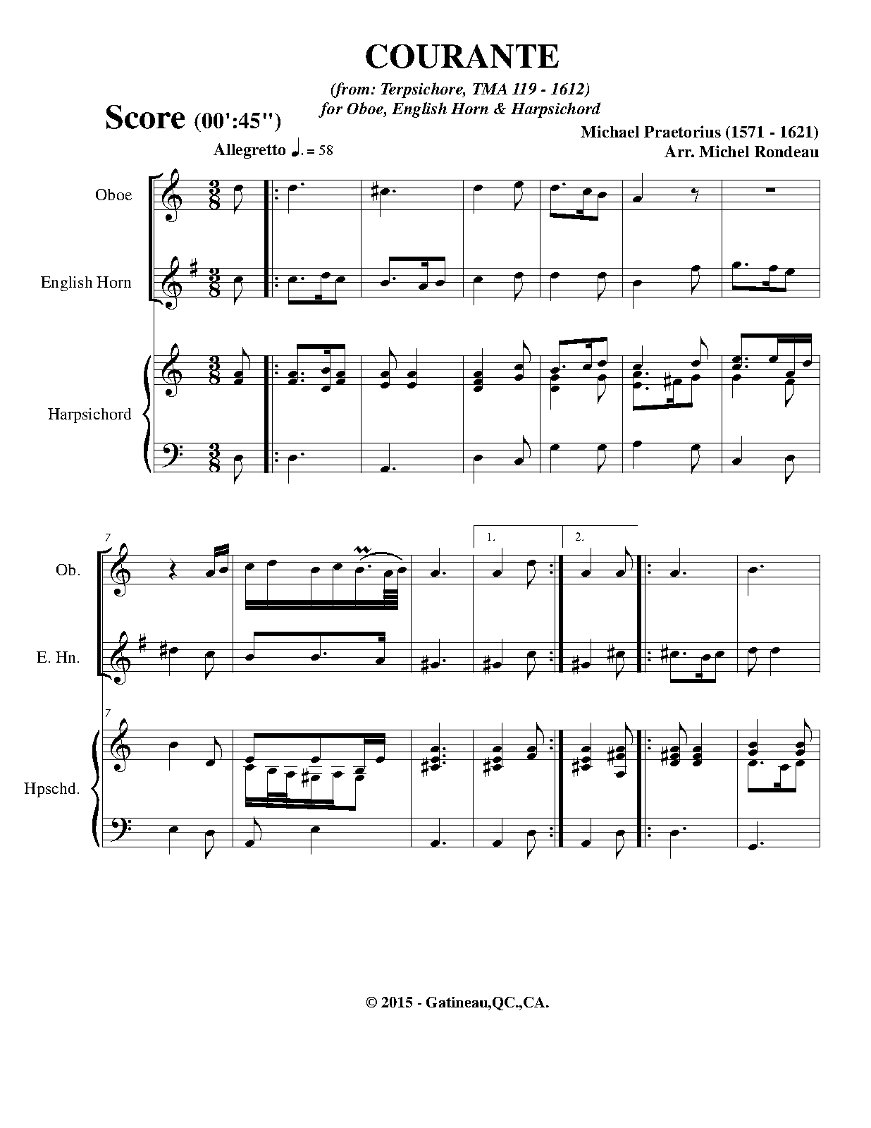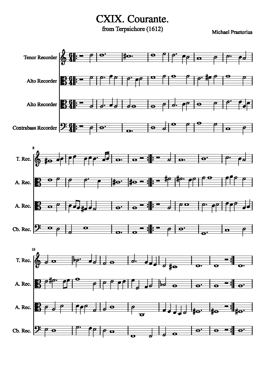 | Extra Information | These pieces were assembled and arranged by Praetorius for his 1612 collection. It is unknown how many, or if any, of the works in the collection were actually composed by Praetorius as opposed to being popular dance tunes arranged by him. The instrumentation is not specified in the original, and simply listed as "à 4". |
