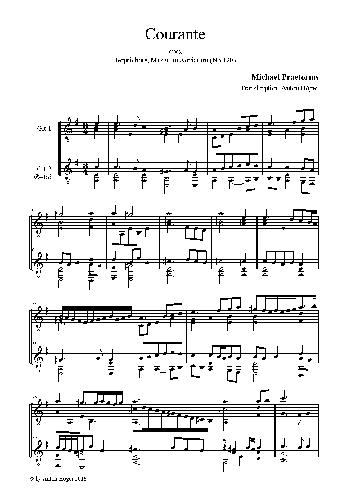| Extra Information | These pieces were assembled and arranged by Praetorius for his 1612 collection. It is unknown how many, or if any, of the works in the collection were actually composed by Praetorius as opposed to being popular dance tunes arranged by him. The instrumentation is not specified in the original, and simply listed as "à 4". |