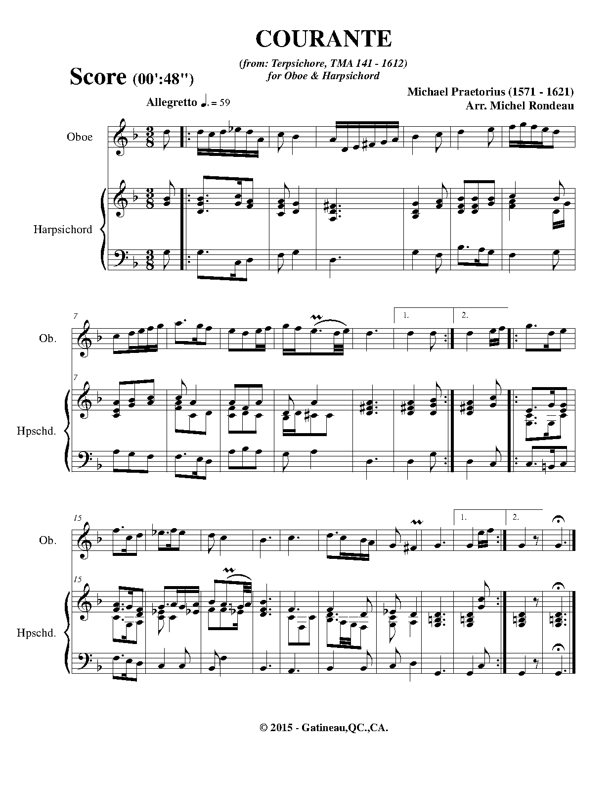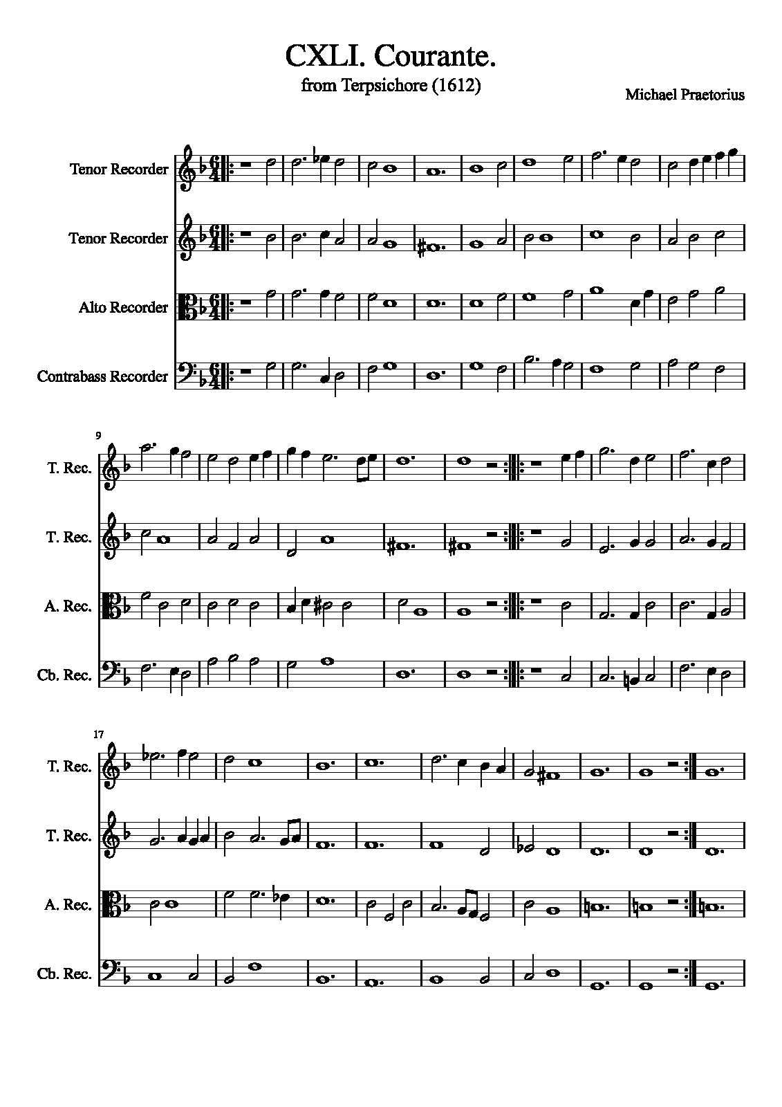 | Extra Information | These pieces were assembled and arranged by Praetorius for his 1612 collection. It is unknown how many, or if any, of the works in the collection were actually composed by Praetorius as opposed to being popular dance tunes arranged by him. The instrumentation is not specified in the original, and simply listed as "à 4". |