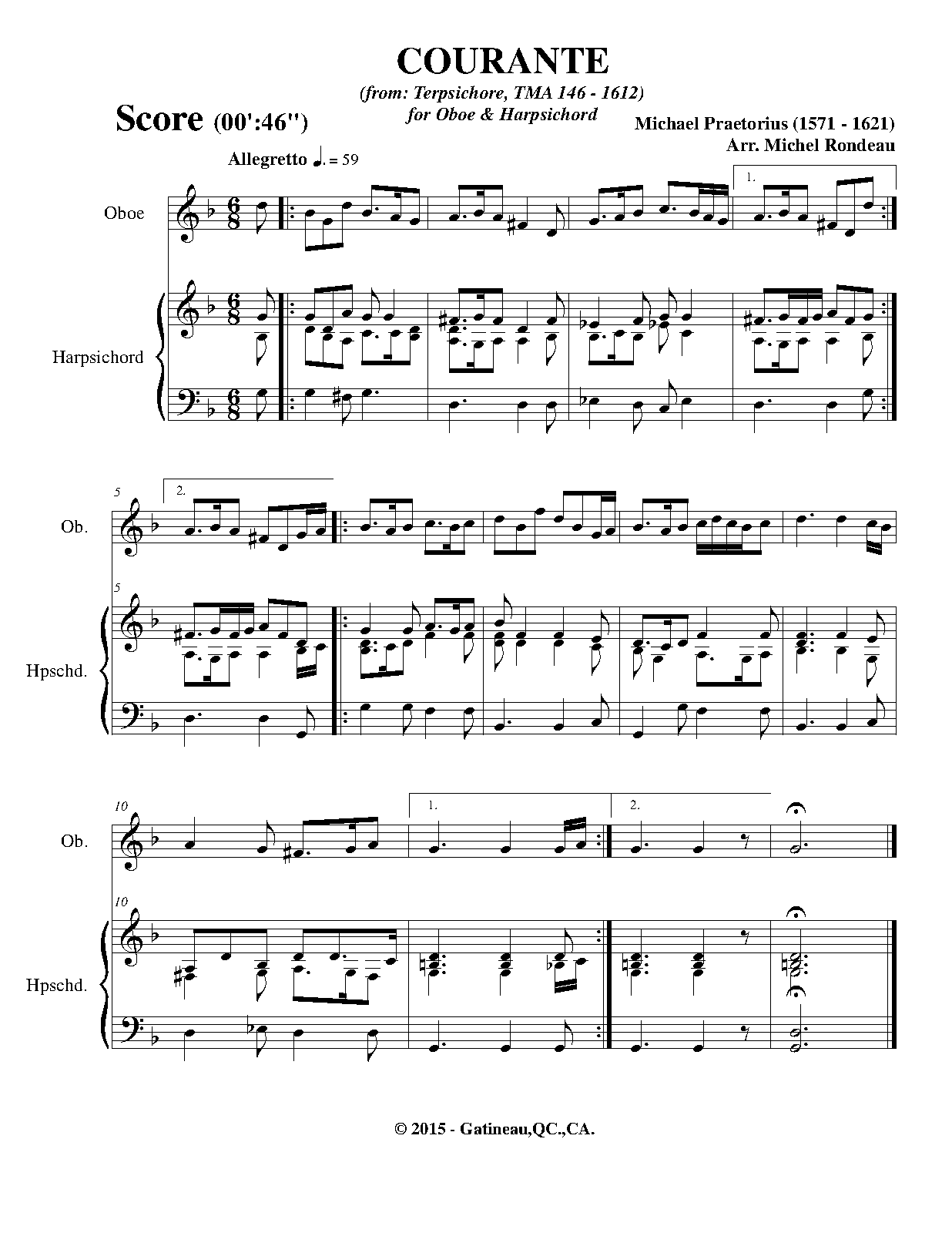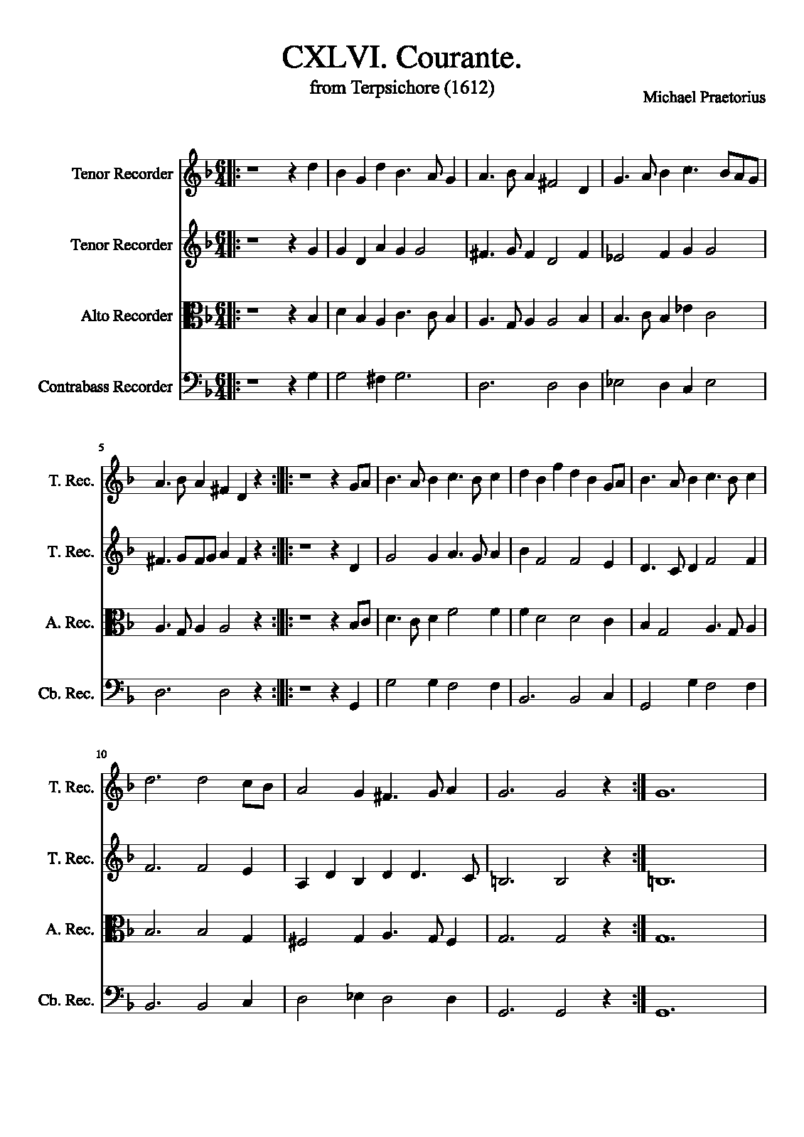 | Extra Information | These pieces were assembled and arranged by Praetorius for his 1612 collection. It is unknown how many, or if any, of the works in the collection were actually composed by Praetorius as opposed to being popular dance tunes arranged by him. The instrumentation is not specified in the original, and simply listed as "à 4". |