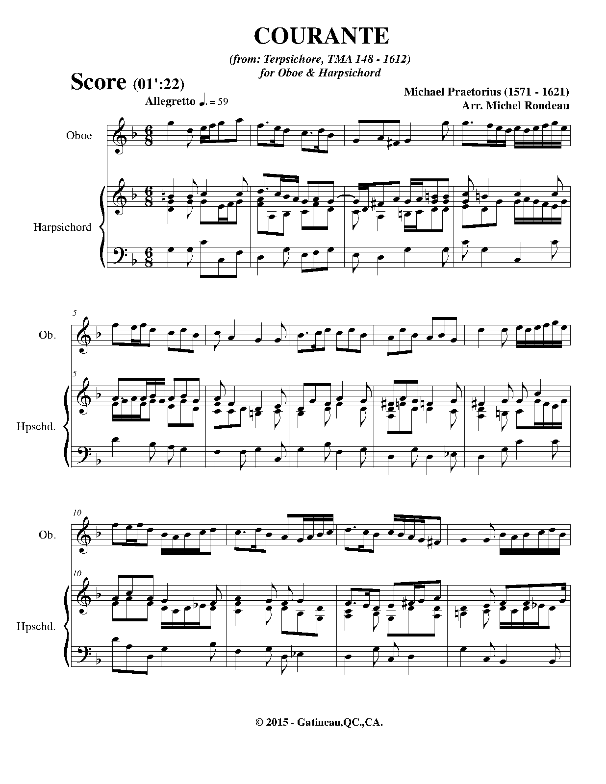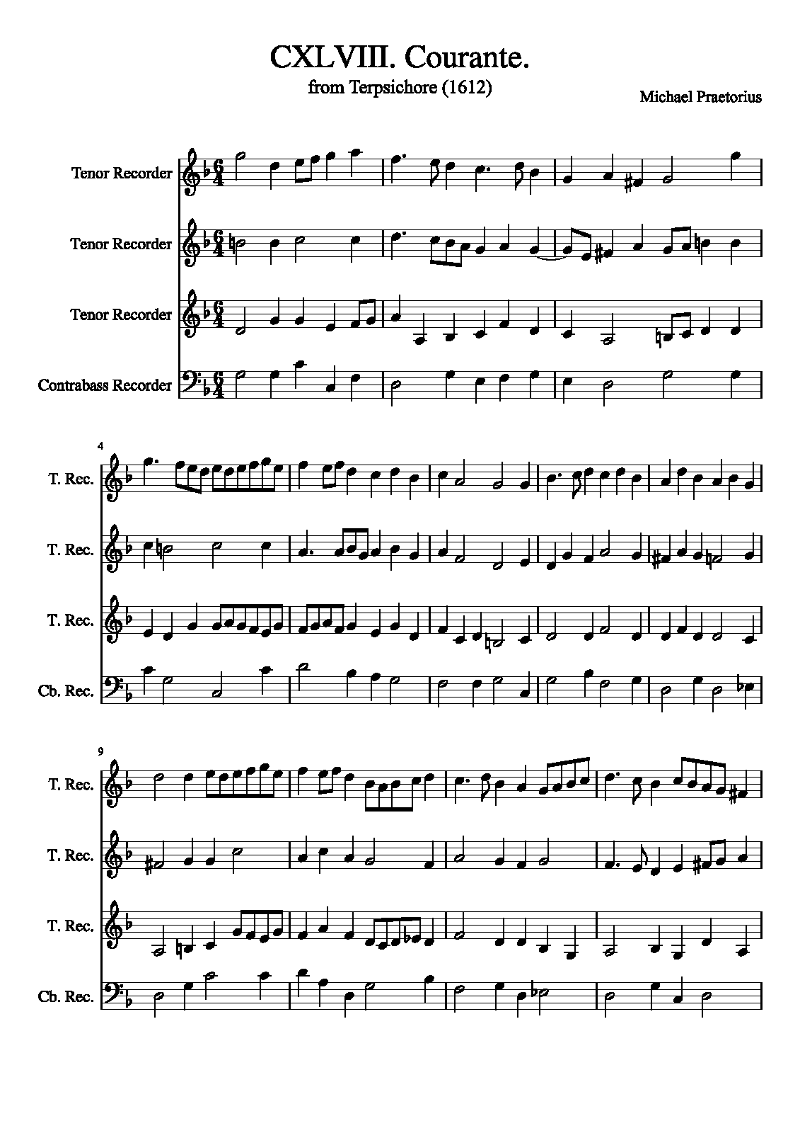 | Extra Information | These pieces were assembled and arranged by Praetorius for his 1612 collection. It is unknown how many, or if any, of the works in the collection were actually composed by Praetorius as opposed to being popular dance tunes arranged by him. The instrumentation is not specified in the original, and simply listed as "à 4". |