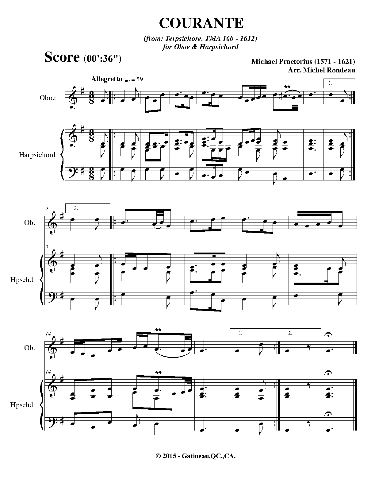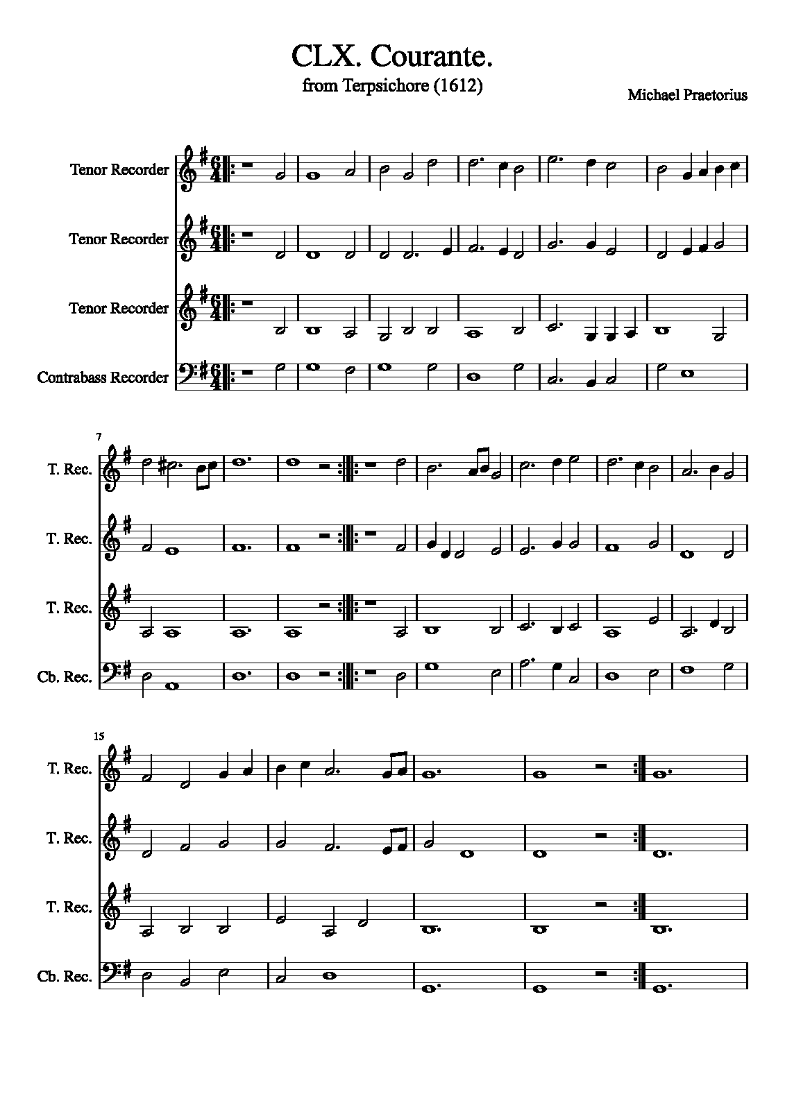 | Extra Information | These pieces were assembled and arranged by Praetorius for his 1612 collection. It is unknown how many, or if any, of the works in the collection were actually composed by Praetorius as opposed to being popular dance tunes arranged by him. The instrumentation is not specified in the original, and simply listed as "à 4". |