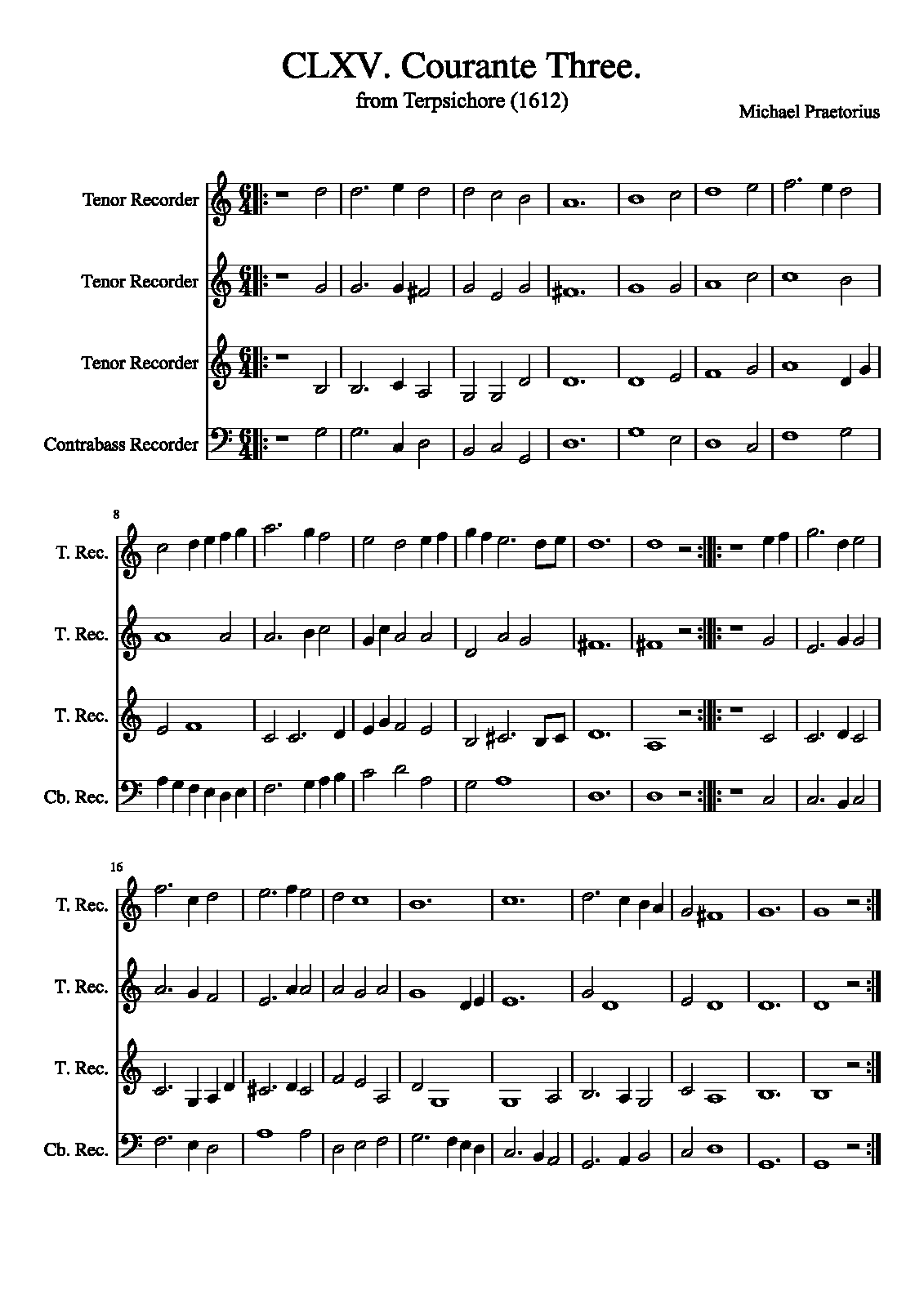 | Extra Information | These pieces were assembled and arranged by Praetorius for his 1612 collection. It is unknown how many, or if any, of the works in the collection were actually composed by Praetorius as opposed to being popular dance tunes arranged by him. The instrumentation is not specified in the original, and simply listed as "à 4". |