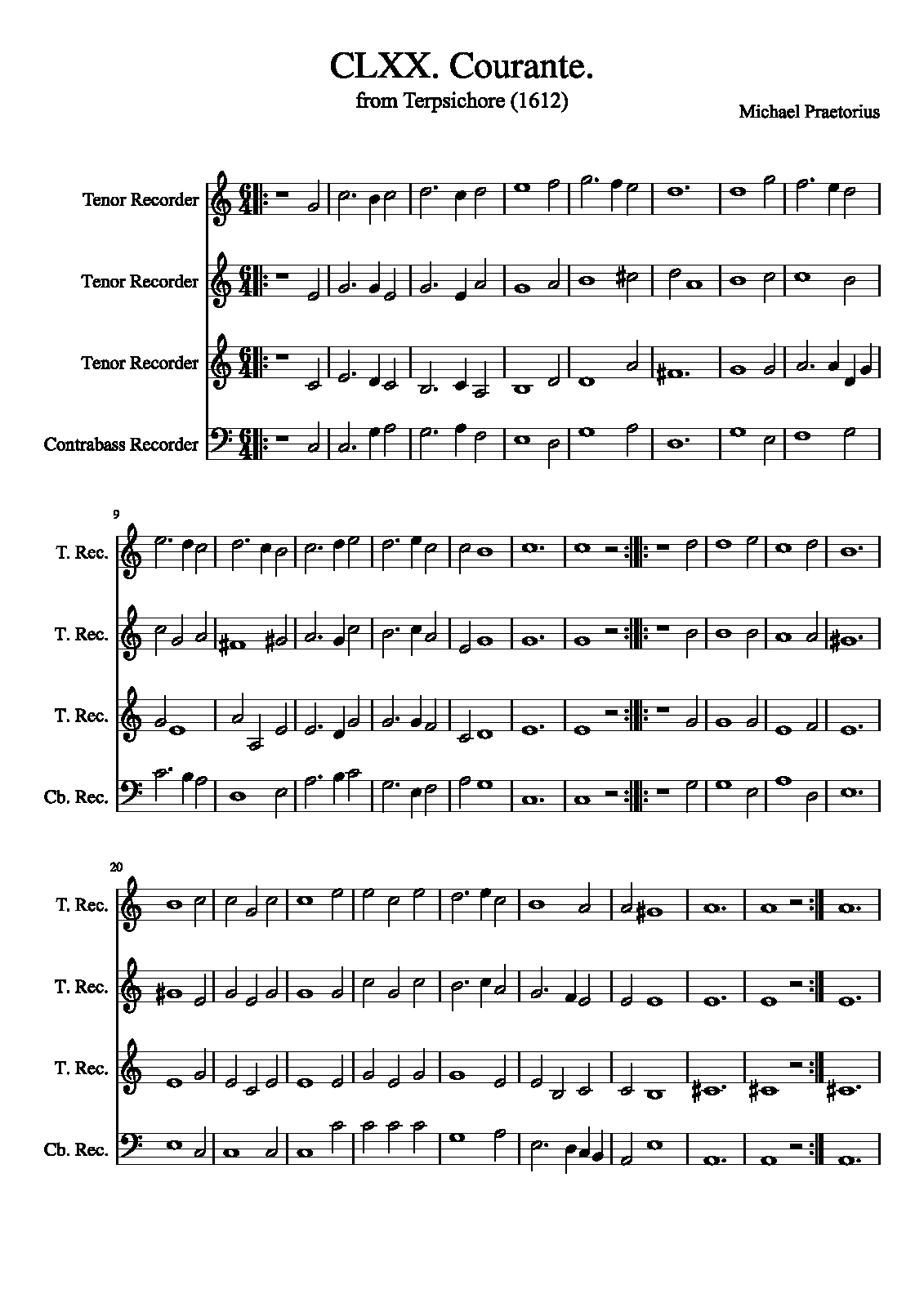 | Extra Information | These pieces were assembled and arranged by Praetorius for his 1612 collection. It is unknown how many, or if any, of the works in the collection were actually composed by Praetorius as opposed to being popular dance tunes arranged by him. The instrumentation is not specified in the original, and simply listed as "à 4". |