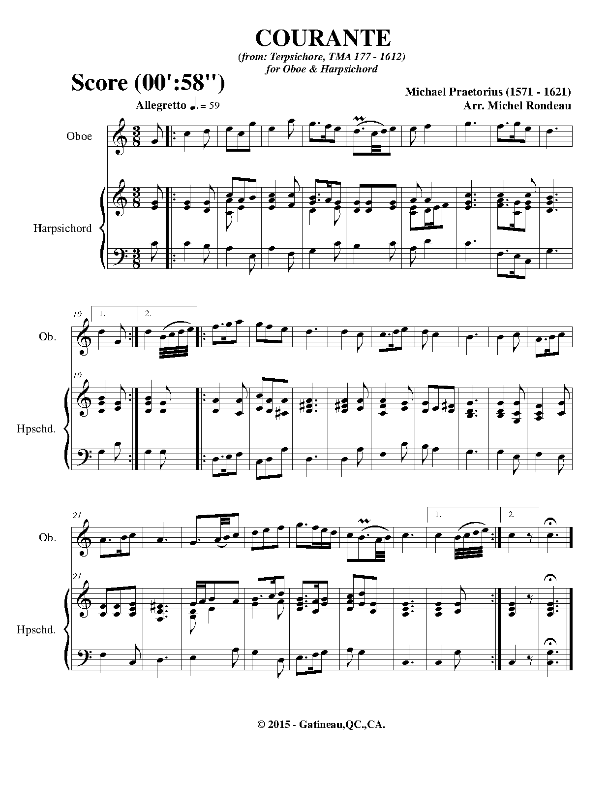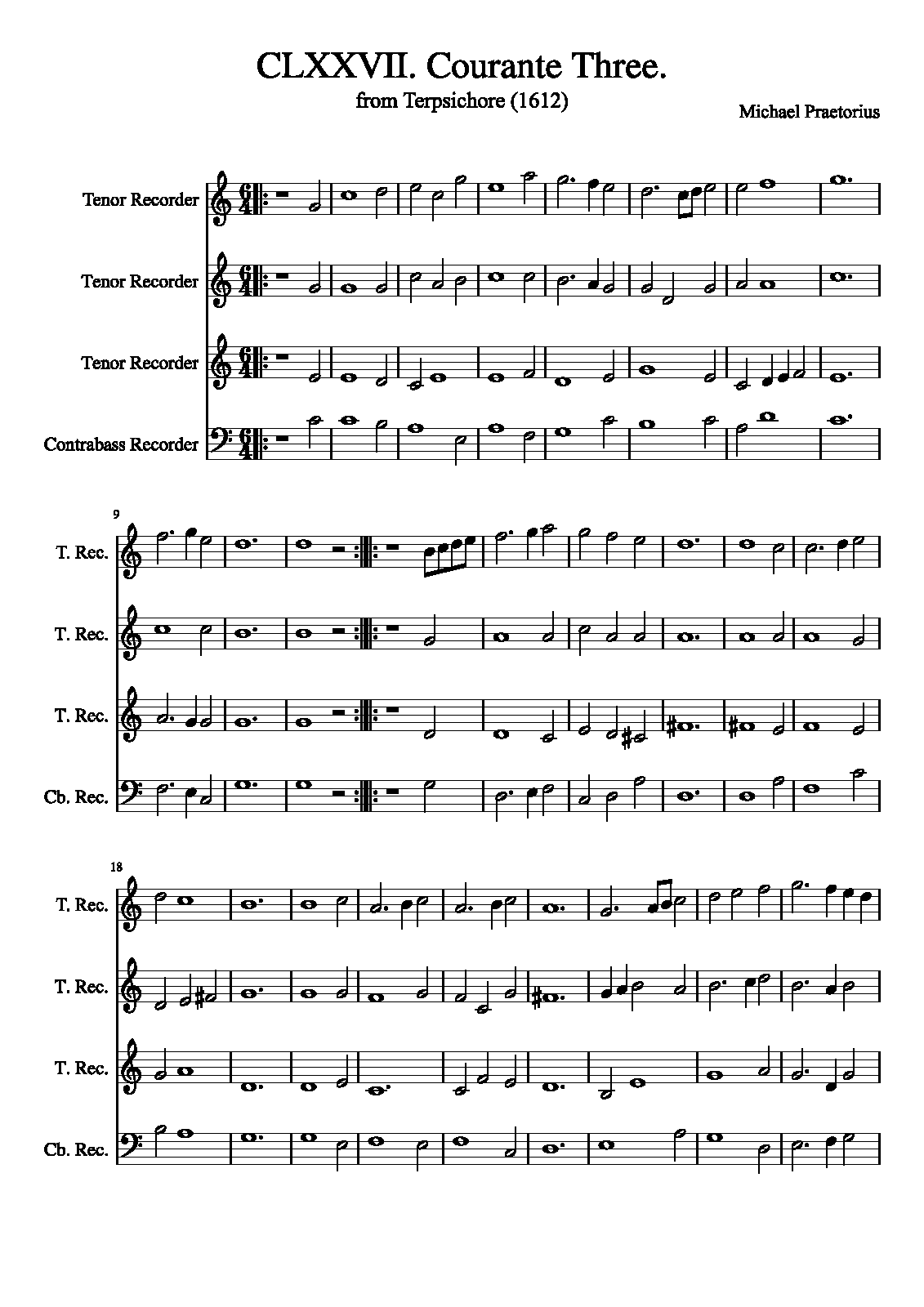 | Extra Information | These pieces were assembled and arranged by Praetorius for his 1612 collection. It is unknown how many, or if any, of the works in the collection were actually composed by Praetorius as opposed to being popular dance tunes arranged by him. The instrumentation is not specified in the original, and simply listed as "à 4". |