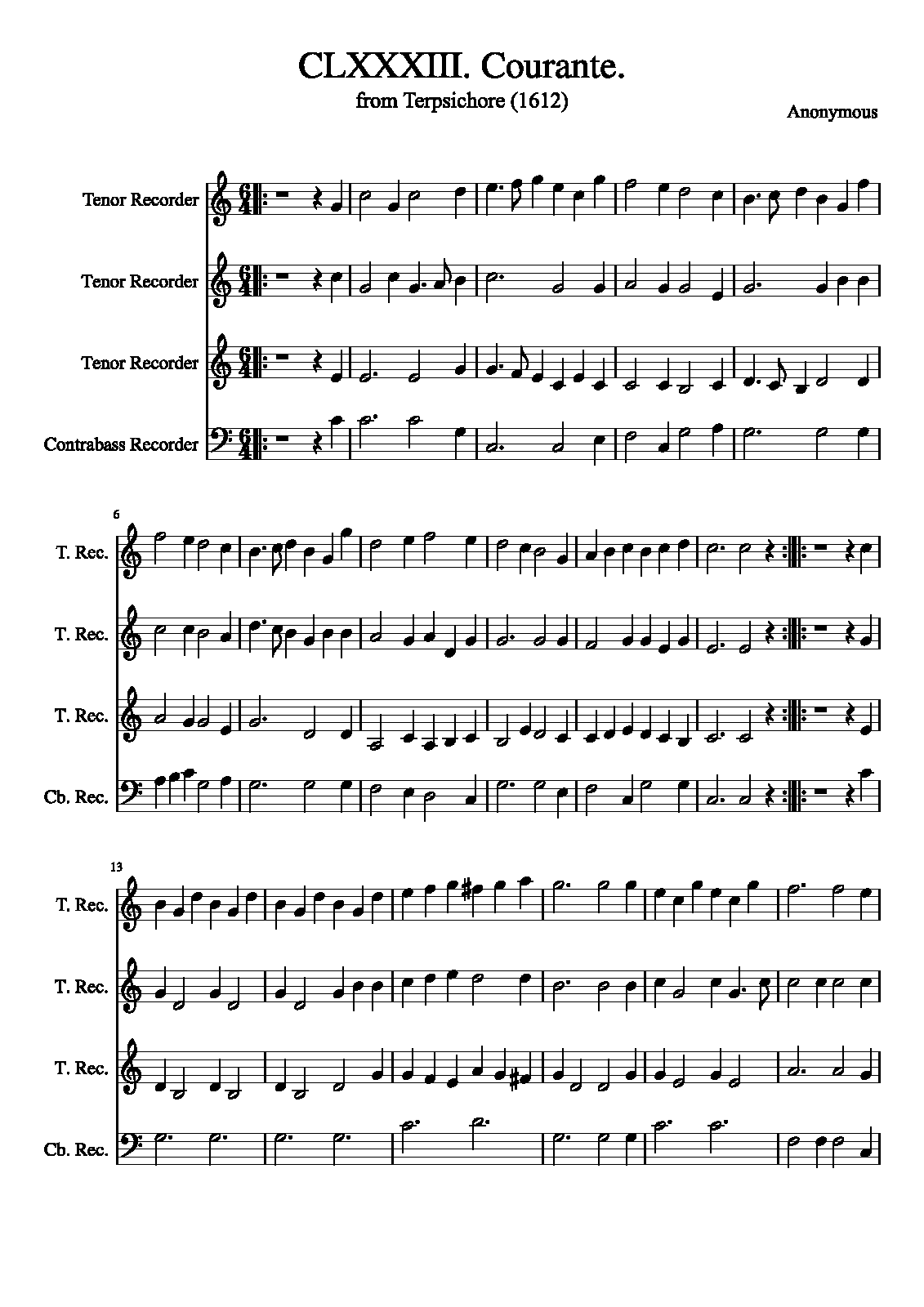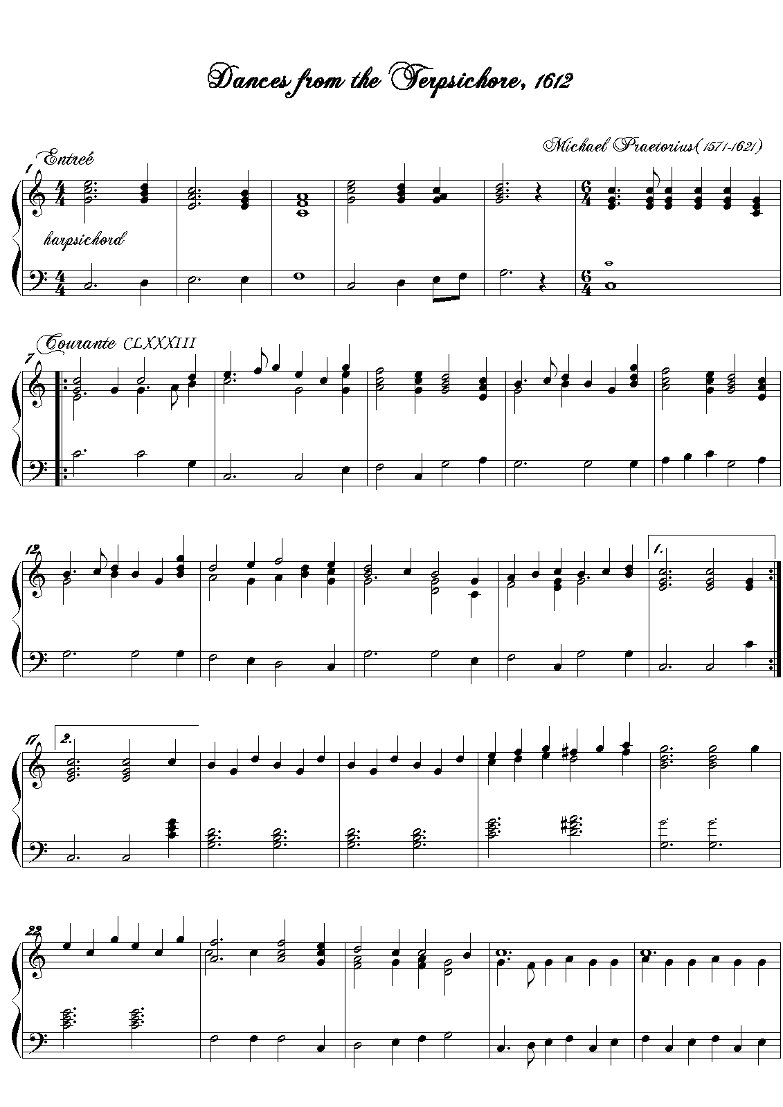 | Extra Information | These pieces were assembled and arranged by Praetorius for his 1612 collection. It is unknown how many, or if any, of the works in the collection were actually composed by Praetorius as opposed to being popular dance tunes arranged by him. The instrumentation is not specified in the original, and simply listed as "à 4". |