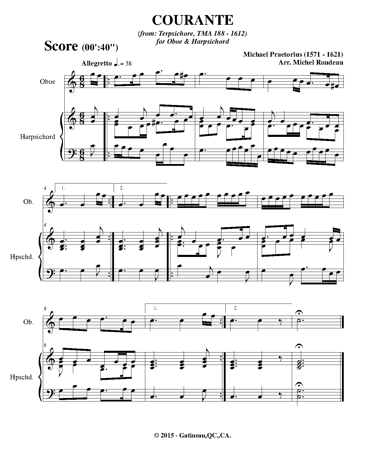 | Extra Information | These pieces were assembled and arranged by Praetorius for his 1612 collection. It is unknown how many, or if any, of the works in the collection were actually composed by Praetorius as opposed to being popular dance tunes arranged by him. The instrumentation is not specified in the original, and simply listed as "à 4". |