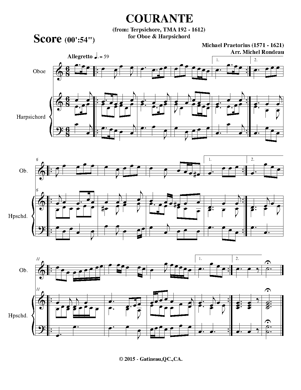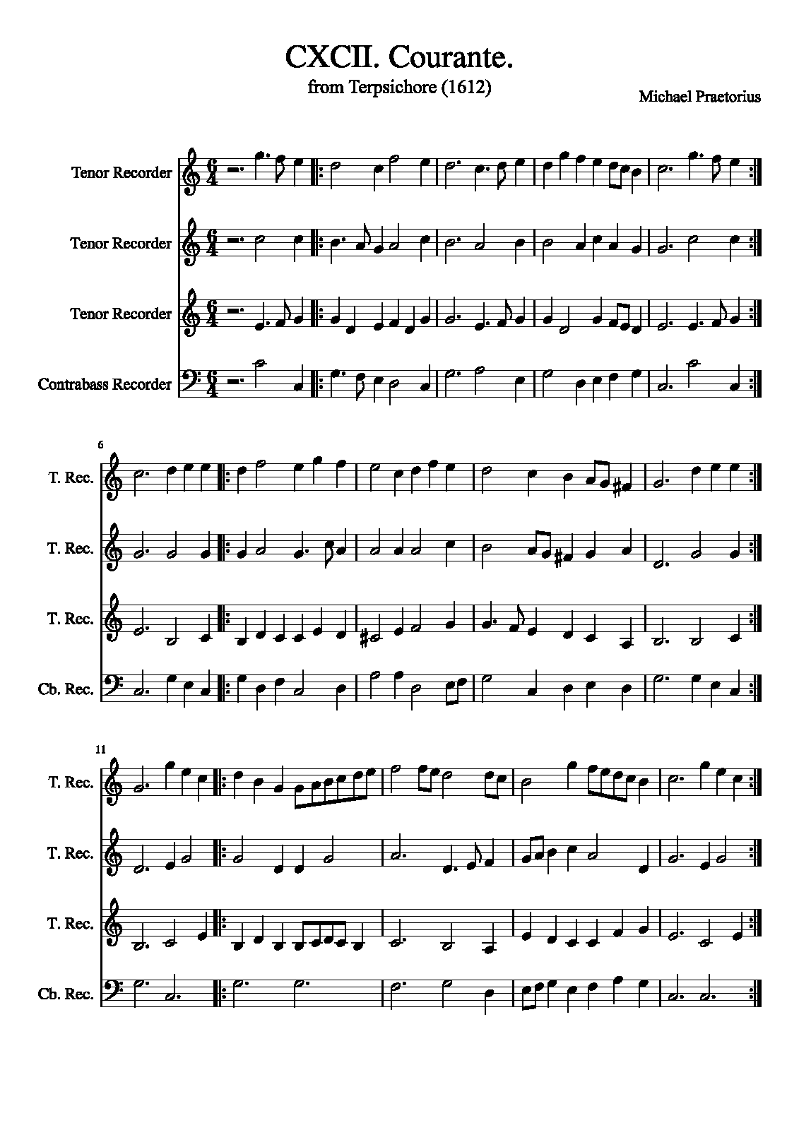 | Extra Information | These pieces were assembled and arranged by Praetorius for his 1612 collection. It is unknown how many, or if any, of the works in the collection were actually composed by Praetorius as opposed to being popular dance tunes arranged by him. The instrumentation is not specified in the original, and simply listed as "à 4". |