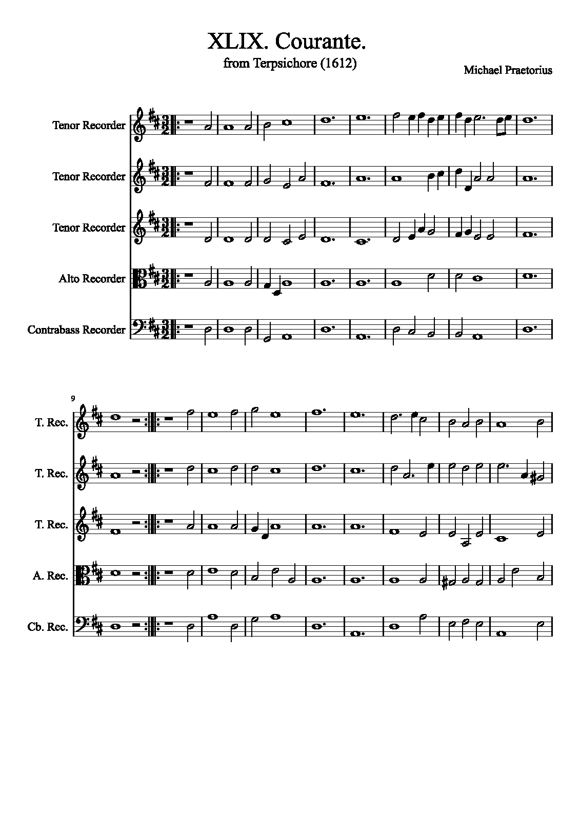 | Extra Information | These pieces were assembled and arranged by Praetorius for his 1612 collection. It is unknown how many, or if any, of the works in the collection were actually composed by Praetorius as opposed to being popular dance tunes arranged by him. The instrumentation is not specified in the original, and simply listed as "à 5". |