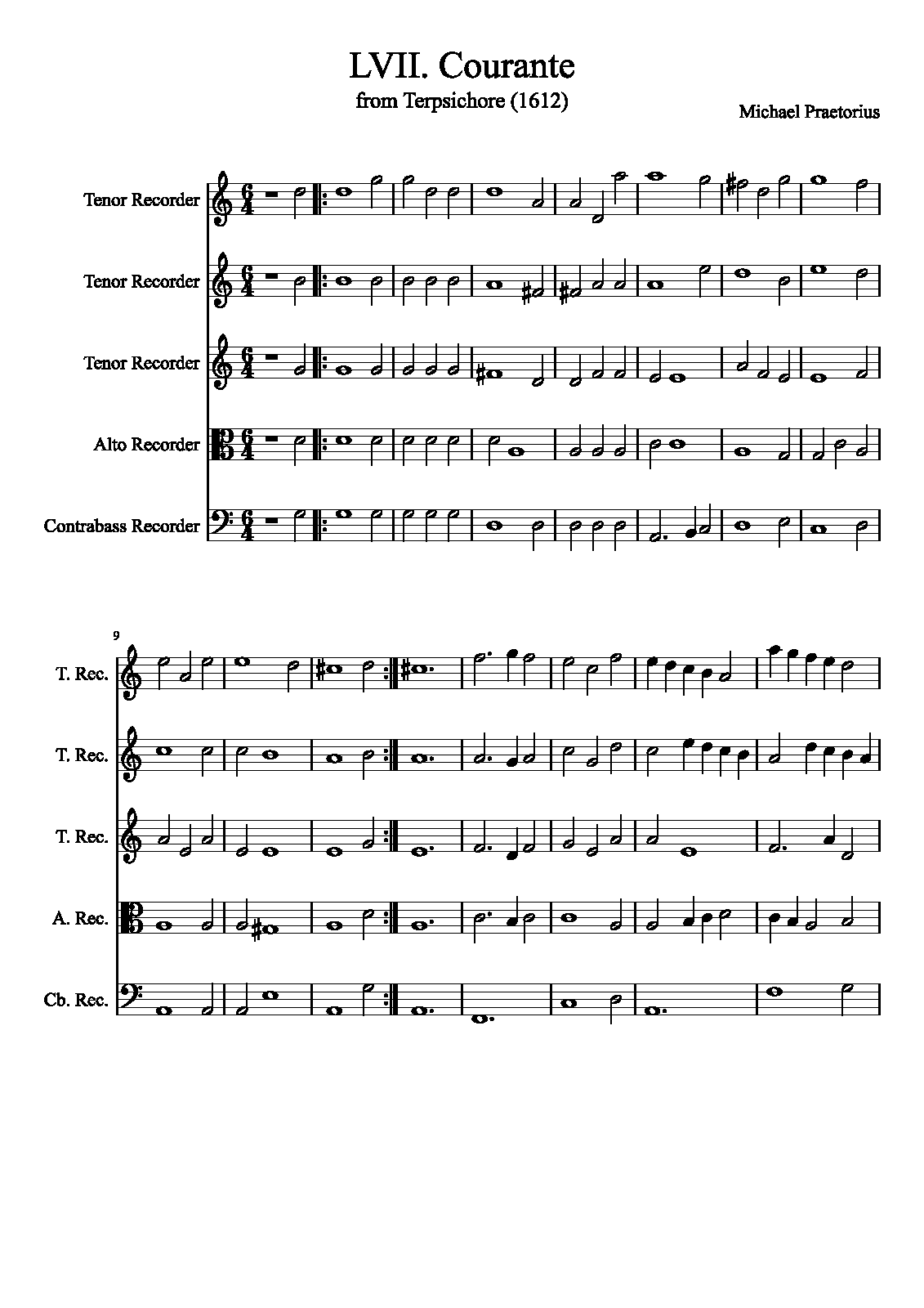 | Extra Information | These pieces were assembled and arranged by Praetorius for his 1612 collection. It is unknown how many, or if any, of the works in the collection were actually composed by Praetorius as opposed to being popular dance tunes arranged by him. The instrumentation is not specified in the original, and simply listed as "à 5". |