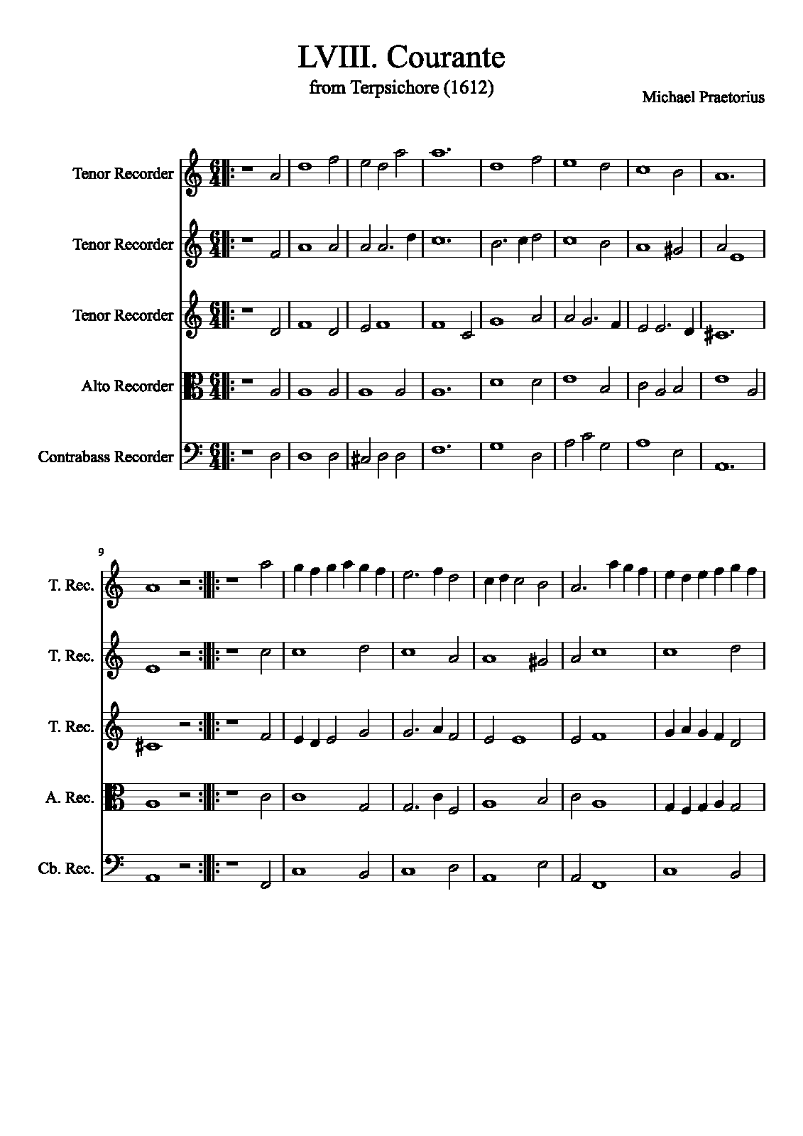 | Extra Information | These pieces were assembled and arranged by Praetorius for his 1612 collection. It is unknown how many, or if any, of the works in the collection were actually composed by Praetorius as opposed to being popular dance tunes arranged by him. The instrumentation is not specified in the original, and simply listed as "à 5". |