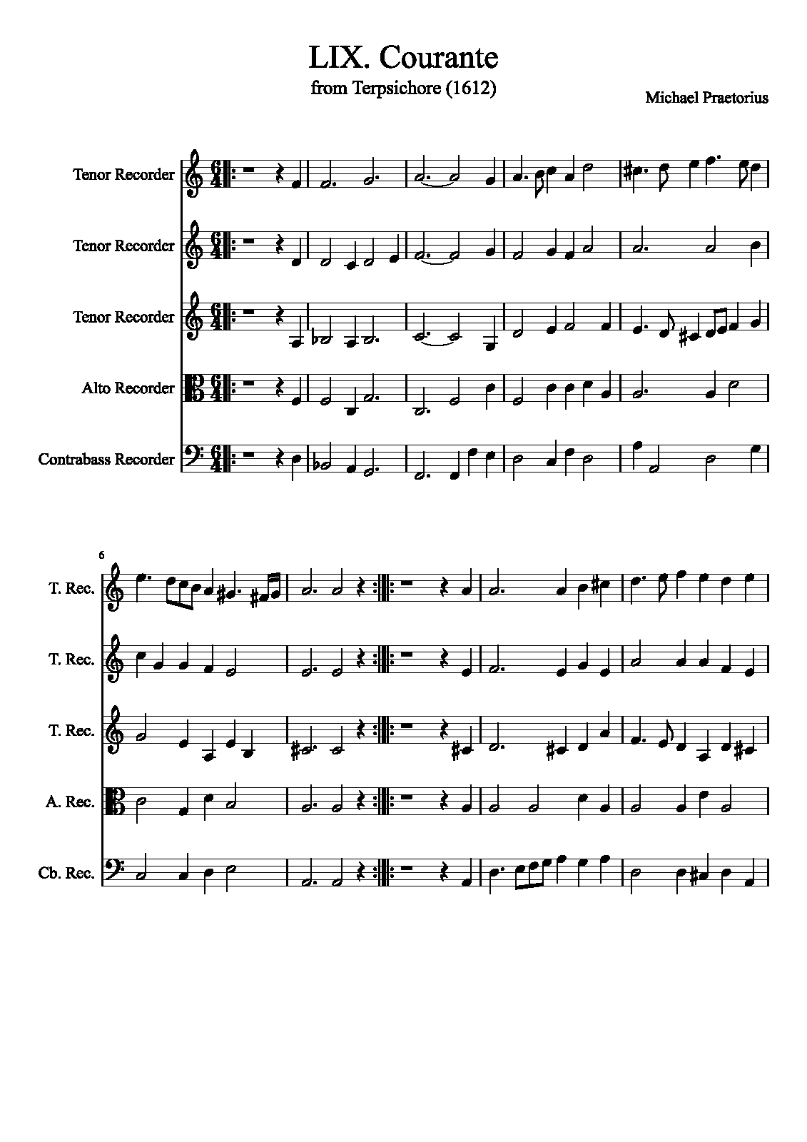 | Extra Information | These pieces were assembled and arranged by Praetorius for his 1612 collection. It is unknown how many, or if any, of the works in the collection were actually composed by Praetorius as opposed to being popular dance tunes arranged by him. The instrumentation is not specified in the original, and simply listed as "à 5". |