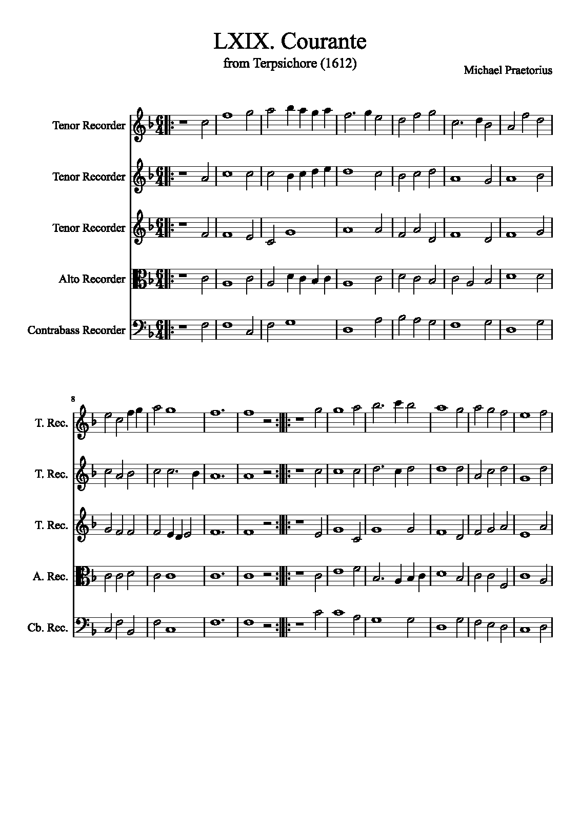 | Extra Information | These pieces were assembled and arranged by Praetorius for his 1612 collection. It is unknown how many, or if any, of the works in the collection were actually composed by Praetorius as opposed to being popular dance tunes arranged by him. The instrumentation is not specified in the original, and simply listed as "à 5". |