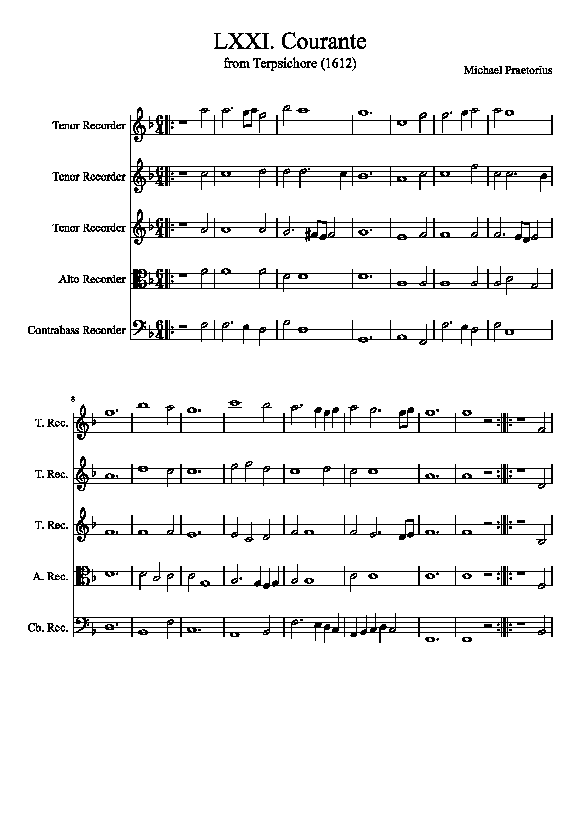 | Extra Information | These pieces were assembled and arranged by Praetorius for his 1612 collection. It is unknown how many, or if any, of the works in the collection were actually composed by Praetorius as opposed to being popular dance tunes arranged by him. The instrumentation is not specified in the original, and simply listed as "à 5". |