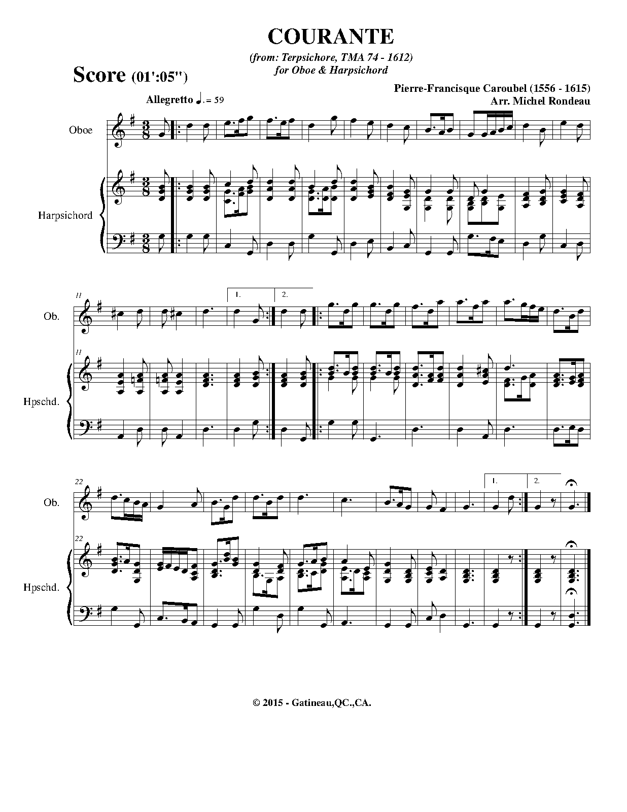 These pieces were assembled and arranged by Praetorius for his 1612 collection. It is unknown how many, or if any, of the works in the collection were actually composed by Caroubel as opposed to being popular dance tunes arranged by him. The instrumentation is not specified in the original, and simply listed as "à 5"