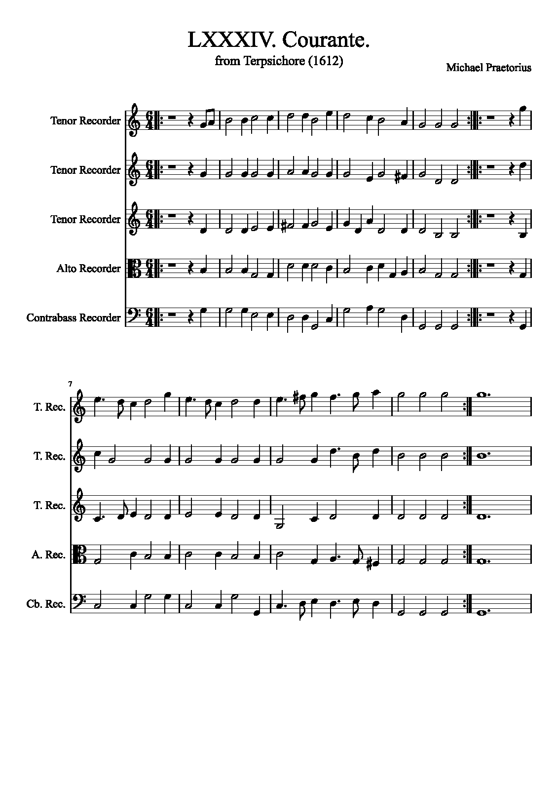| Extra Information | These pieces were assembled and arranged by Praetorius for his 1612 collection. It is unknown how many, or if any, of the works in the collection were actually composed by Praetorius as opposed to being popular dance tunes arranged by him. The instrumentation is not specified in the original, and simply listed as "à 5". |