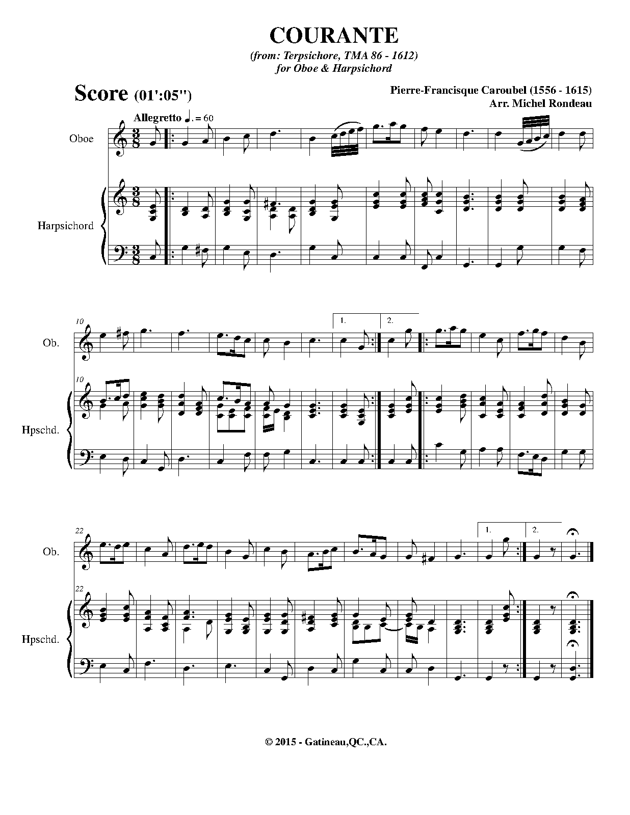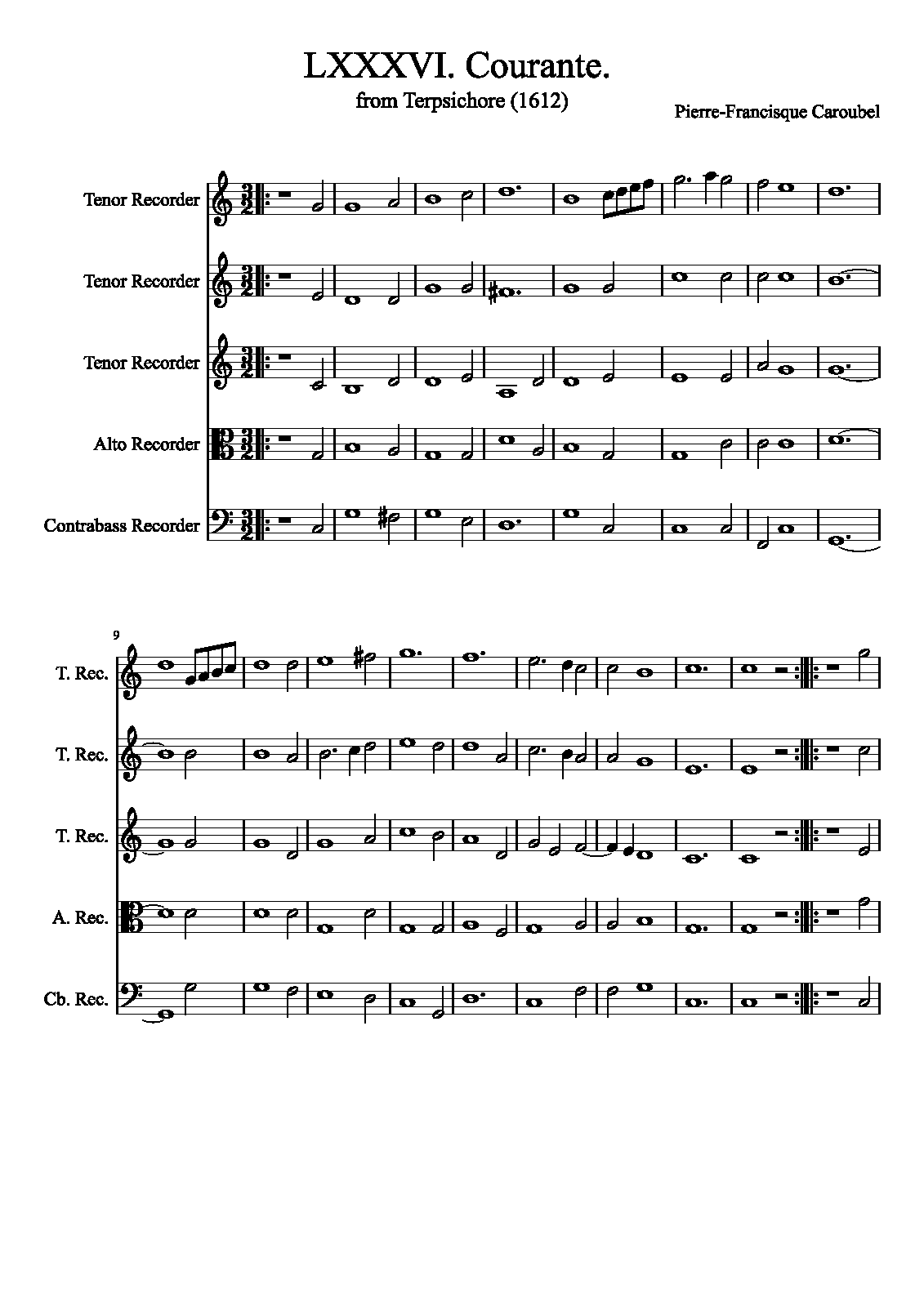 These pieces were assembled and arranged by Praetorius for his 1612 collection. It is unknown how many, or if any, of the works in the collection were actually composed by Caroubel as opposed to being popular dance tunes arranged by him. The instrumentation is not specified in the original, and simply listed as "à 5"