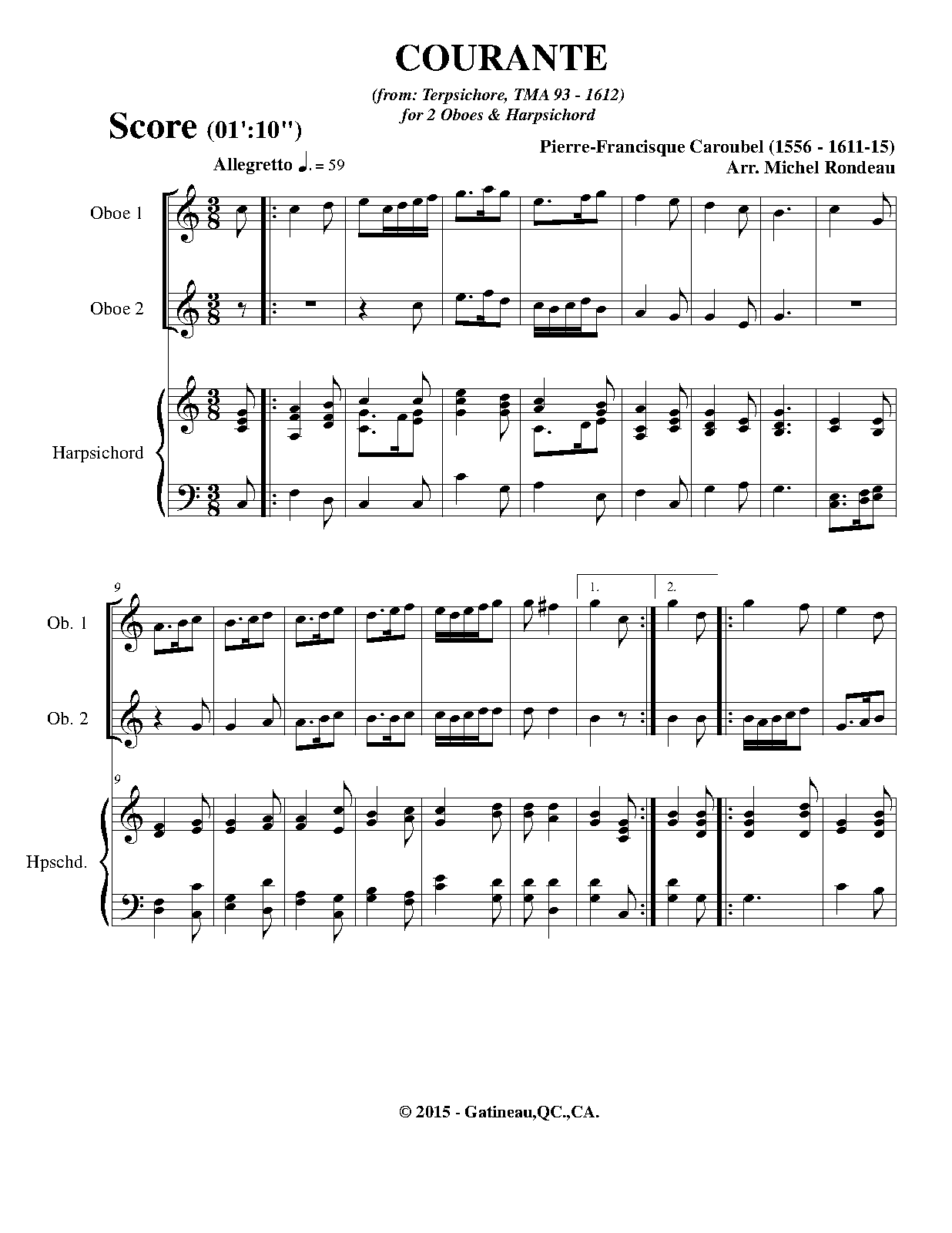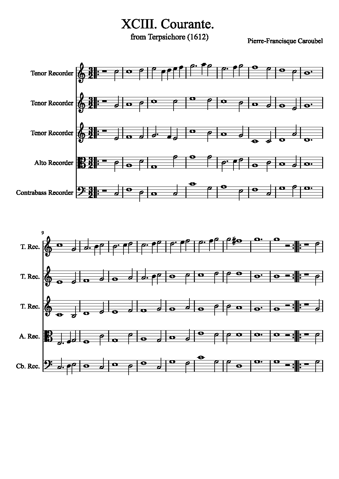 These pieces were assembled and arranged by Praetorius for his 1612 collection. It is unknown how many, or if any, of the works in the collection were actually composed by Caroubel as opposed to being popular dance tunes arranged by him. The instrumentation is not specified in the original, and simply listed as "à 5"